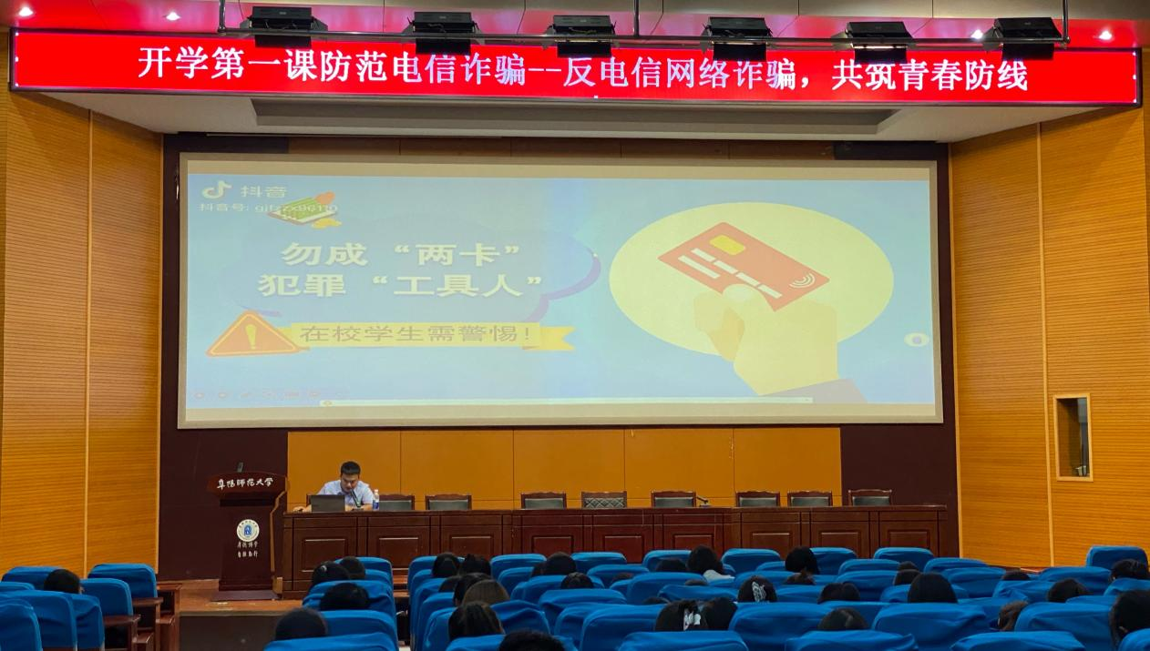 为贯彻落实党的二十大精神和习近平总书记关于打击治理电信网络诈骗犯罪工作的重要指示精神,持续深化校园反诈宣传教育,提高对电信网络诈骗的警惕性,进一步加强学生思想政治教育和安全教育,9月23日,外国语学院邀请2023届毕业生、中国农业银行阜南支行工作人员杨海洋,举办“反电信网络诈骗,共筑青春防线”的知识讲座。
