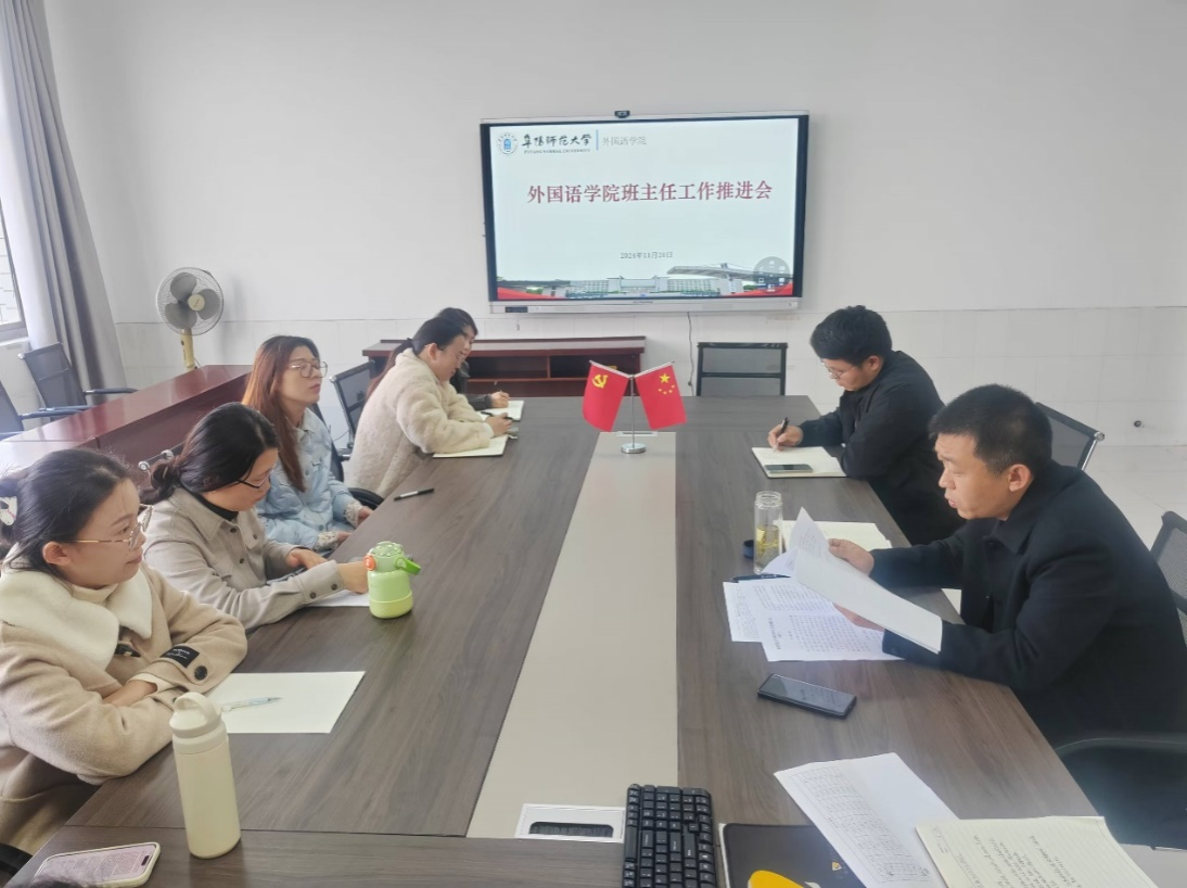 为充分发挥班主任在学生思想政治教育中的作用,切实提升班主任的专业素养和管理能力,11月20日,外国语学院在景行楼802召开班主任工作推进会,学院党委副书记、纪委书记戴亮,各班级班主任及辅导员参会。会议由戴亮主持。