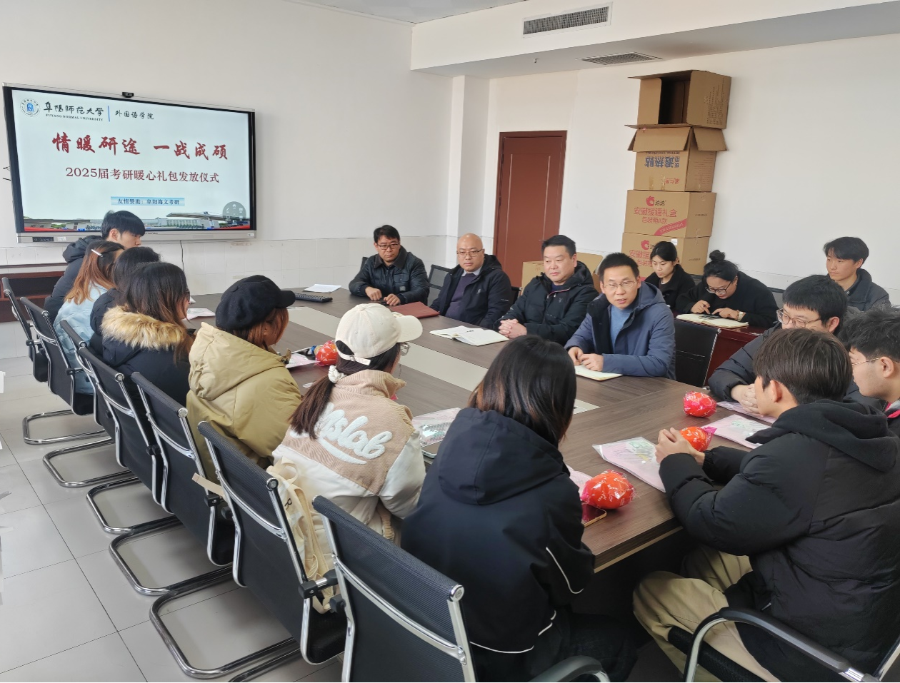 为缓解考研学子备考压力,提振考研信心,12月13日,在2025年全国硕士研究生招生初试前一周,外国语学院在景行楼802开展“情暖研途,一战成硕”考研学子暖心礼包发放活动,学院党委书记刘张飞、院长赵从义、副院长高福猛、阜阳海文考研校长郑立明及毕业班辅导员参加活动,现场为考研学生发放暖心礼包,送上温暖和鼓励。