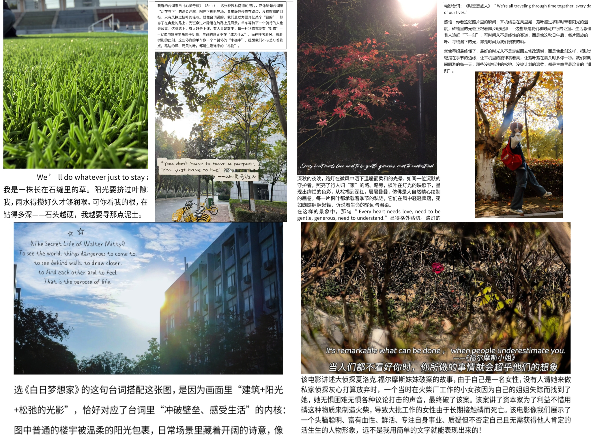 11月25—30日,“秋景映词·光影润人心”活动鼓励同学们在寻觅镜头语言与台词意境契合点的过程中,主动慢下脚步,深度观察身边被忽略的自然细节,在光影定格间完成对影视疗愈力量的现实印证与个人化解读,既缓解了日常压力,也从自然与经典中获得双重治愈。