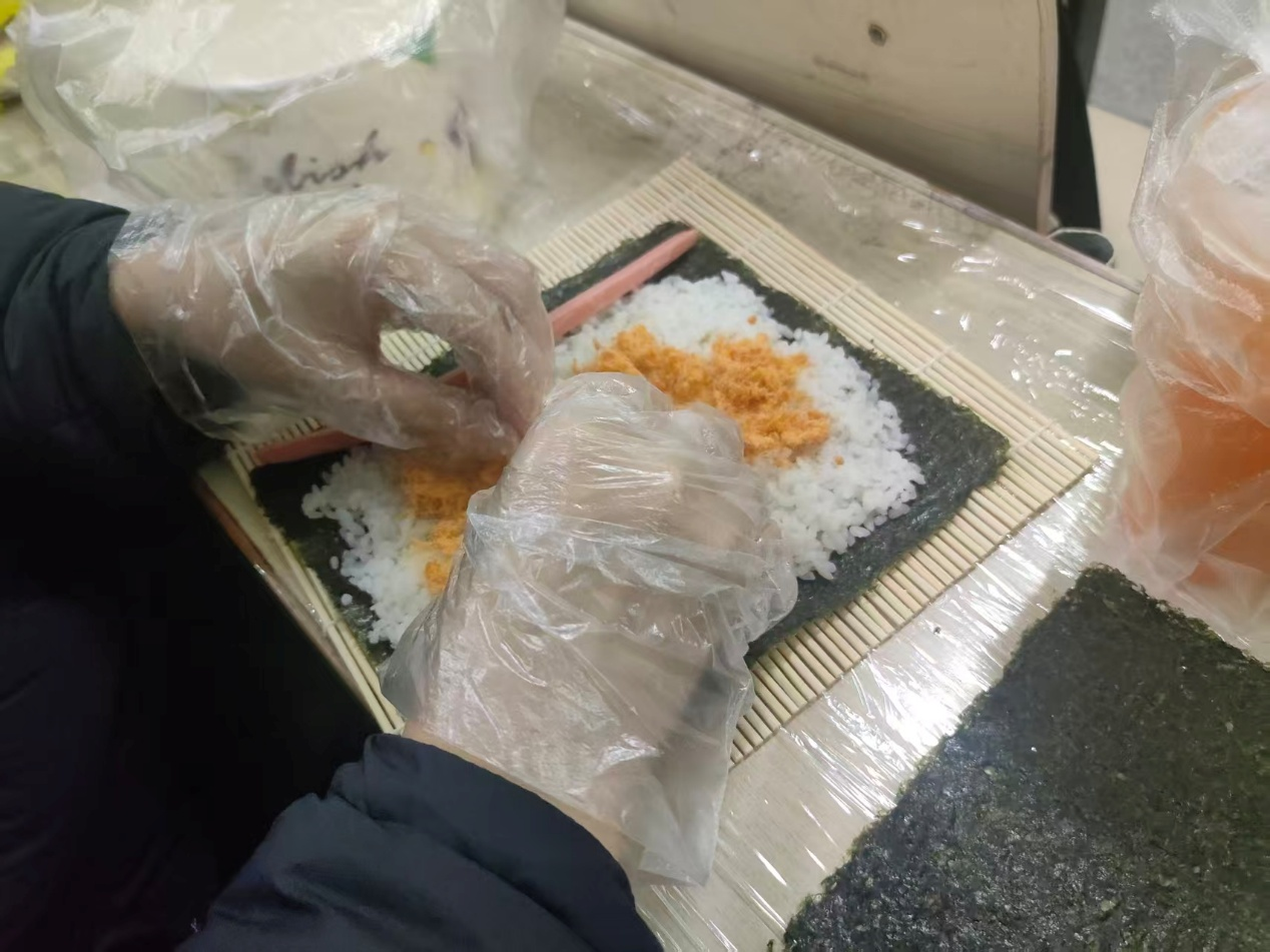 活动当天,佐藤匠为大家系统讲解了寿司的历史起源、文化内涵及食材搭配知识,并在此过程中进行日语单词及语法教学。随后,在教师的逐步示范与细致指导下,同学们亲手铺饭、搭配食材、细心卷制、用心切分,将理论转化为实践。大家一边交流所学单词,分享制作技巧,一边展示、品尝寿司成品,教室里充满了欢声笑语与美食的香气。