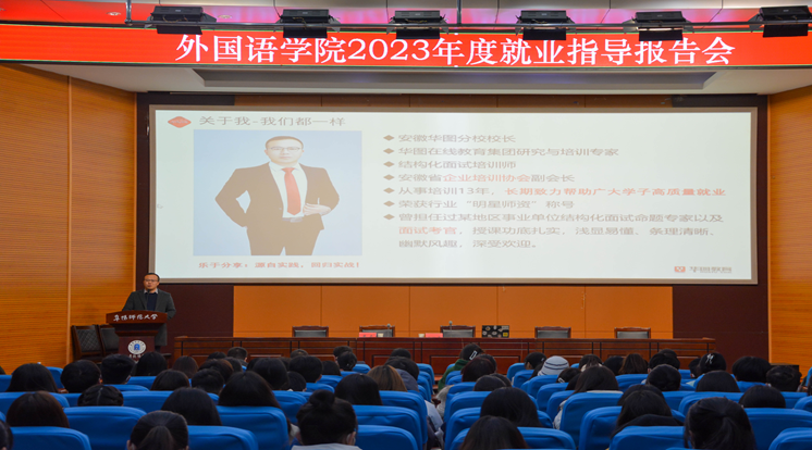 为引导学生树立正确的就业观和择业观,增强职业发展意识和职业规划能力,3月18日下午,外国语学院邀请华图教育安徽分校校长王运龙在躬行F楼报告厅开展就业指导专题报告会。外国语学院党委副书记戴亮主持报告会,各班级学生代表参加报告会学习。