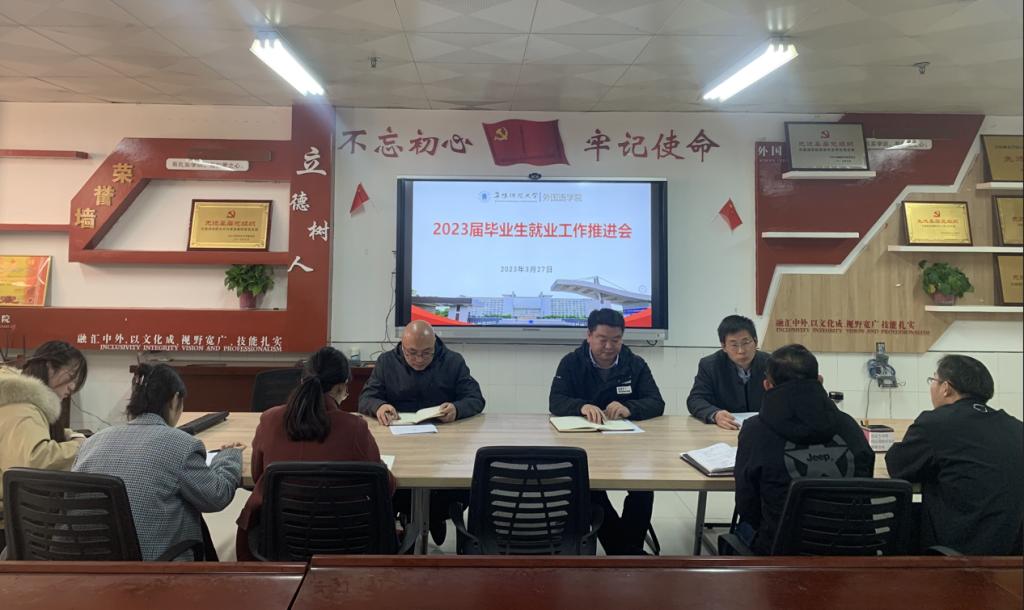 3月27日上午,外国语学院召开2023届毕业生就业工作推进会,传达学校就业工作推进会精神,听取各毕业班辅导员工作汇报,研究部署下一步工作举措。学院党政班子、系部主任、毕业班辅导员参加会议。