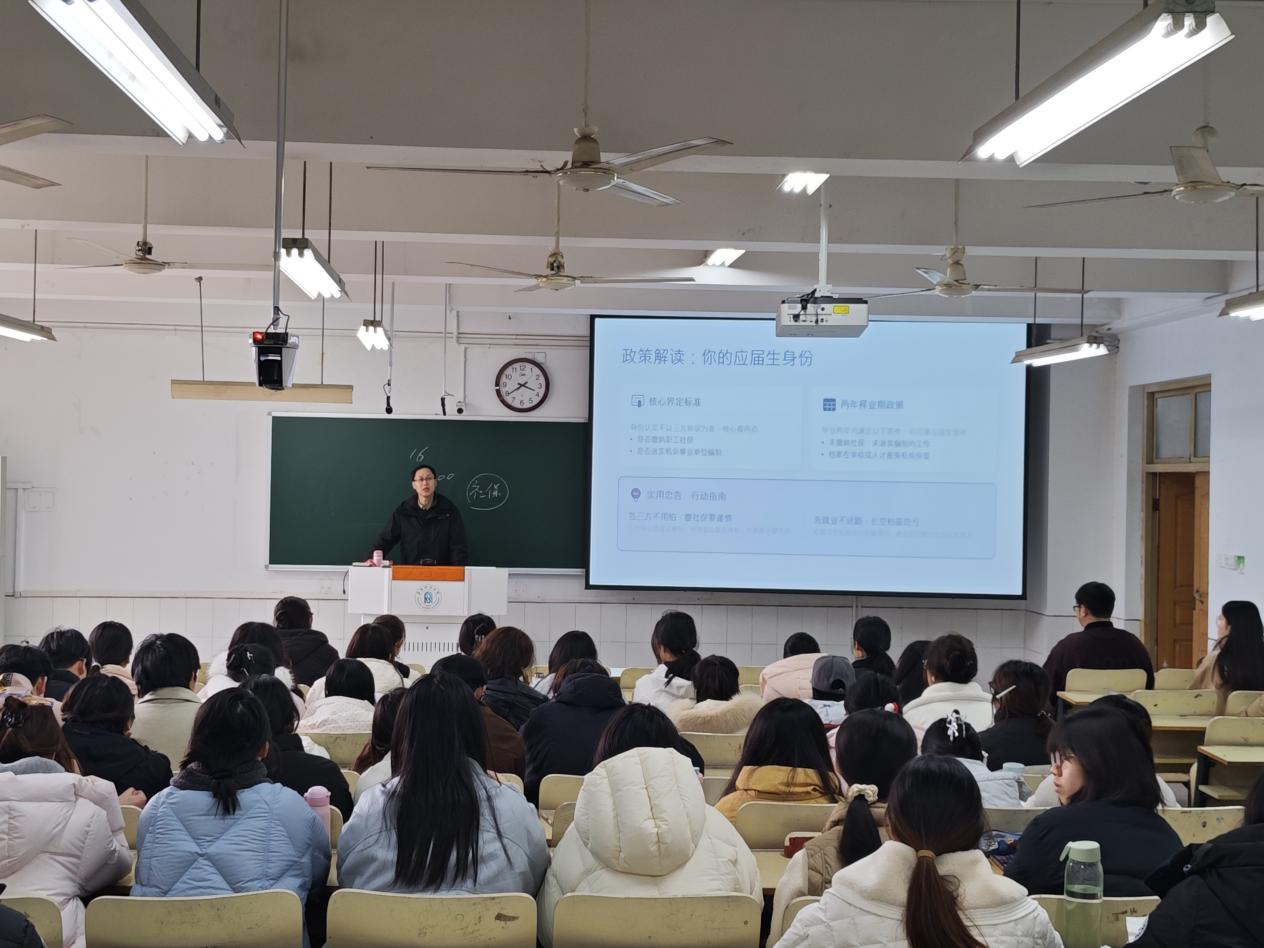 李阳深入解读了当前的就业形势,用翔实的数据分析了当前的就业压力,介绍了外语专业的潜在机遇,引导同学们理性看待就业压力。仔细梳理了学院的历年就业情况,让同学们清晰地了解了学院就业工作的扎实基础和过往成果,增强了大家的就业信心。结合学生求职过程中常见的三方协议、劳动合同、试用期权益等问题,用通俗易懂的语言解读了劳动法核心条款,提醒同学们警惕求职陷阱,倡导大家诚信求职、规范就业,为顺利步入职场筑牢法律基础。