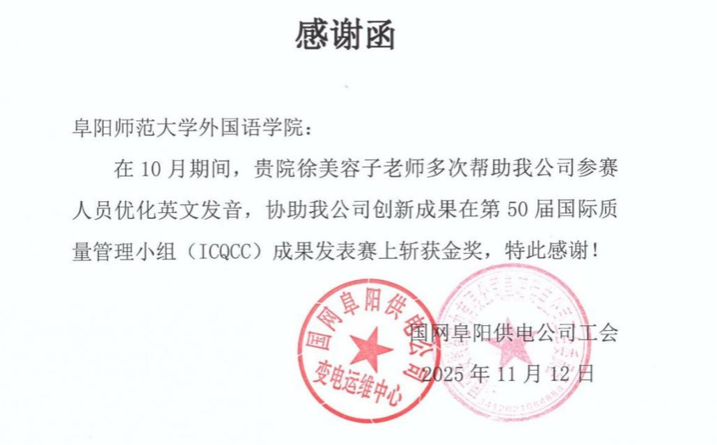 近日,外国语学院翻译系教师徐美容子收到国家电网阜阳供电公司感谢函,感谢其提供语言服务支持,助力该公司创新成果在第50届国际质量管理小组会议(ICQCC)成果发表赛中斩获金奖。这是该公司在质量管理领域首次获得的国际大奖。