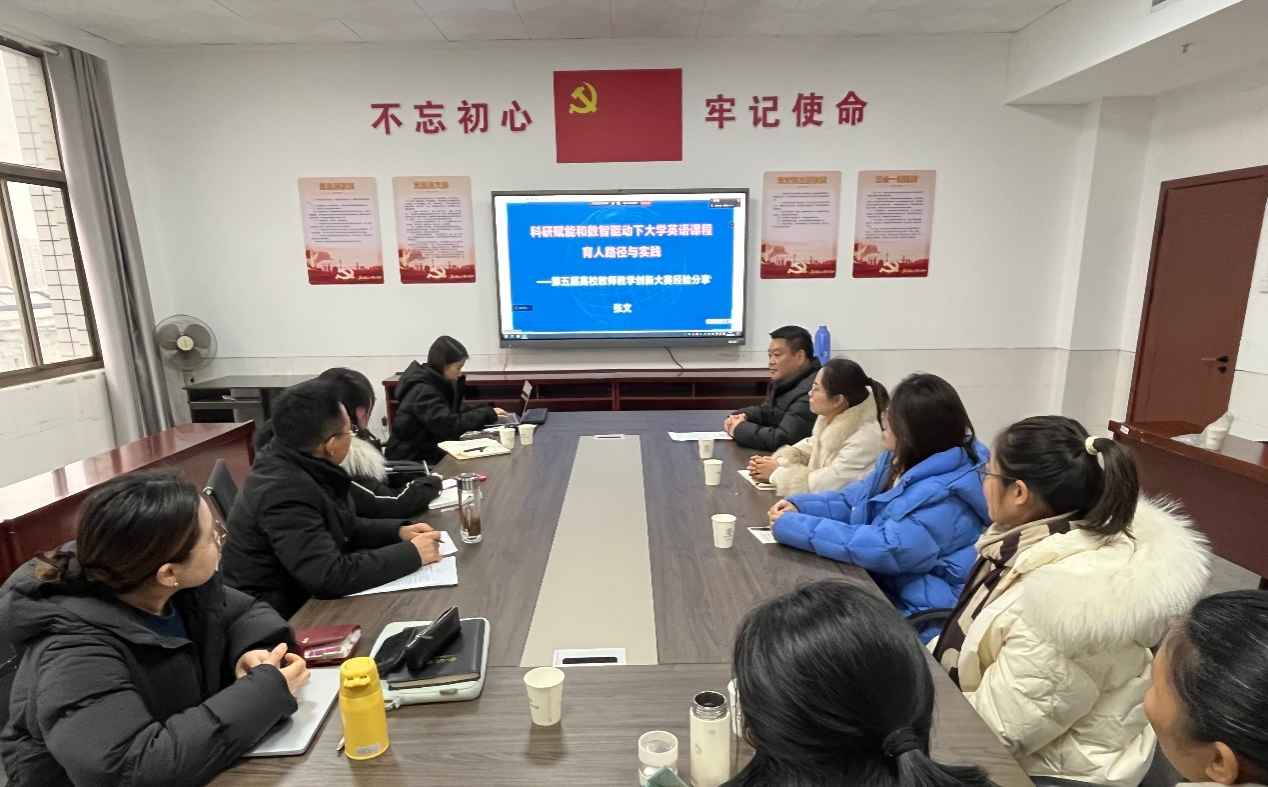 为扎实推进第六届全国高校教师教学创新大赛备赛工作,助力参赛教师明确备赛方向,1月18日下午,外国语学院特邀第五届全国高校教师教学创新大赛安徽赛区新文科正高组一等奖获得者、安庆师范大学张文教授,为我院教师开展题为“科研赋能和数智驱动下大学英语课程育人路径与实践”的专题讲座。学院领导、各系部主任及教师代表通过线上线下相结合的方式参会,讲座由外国语学院院长赵从义主持。