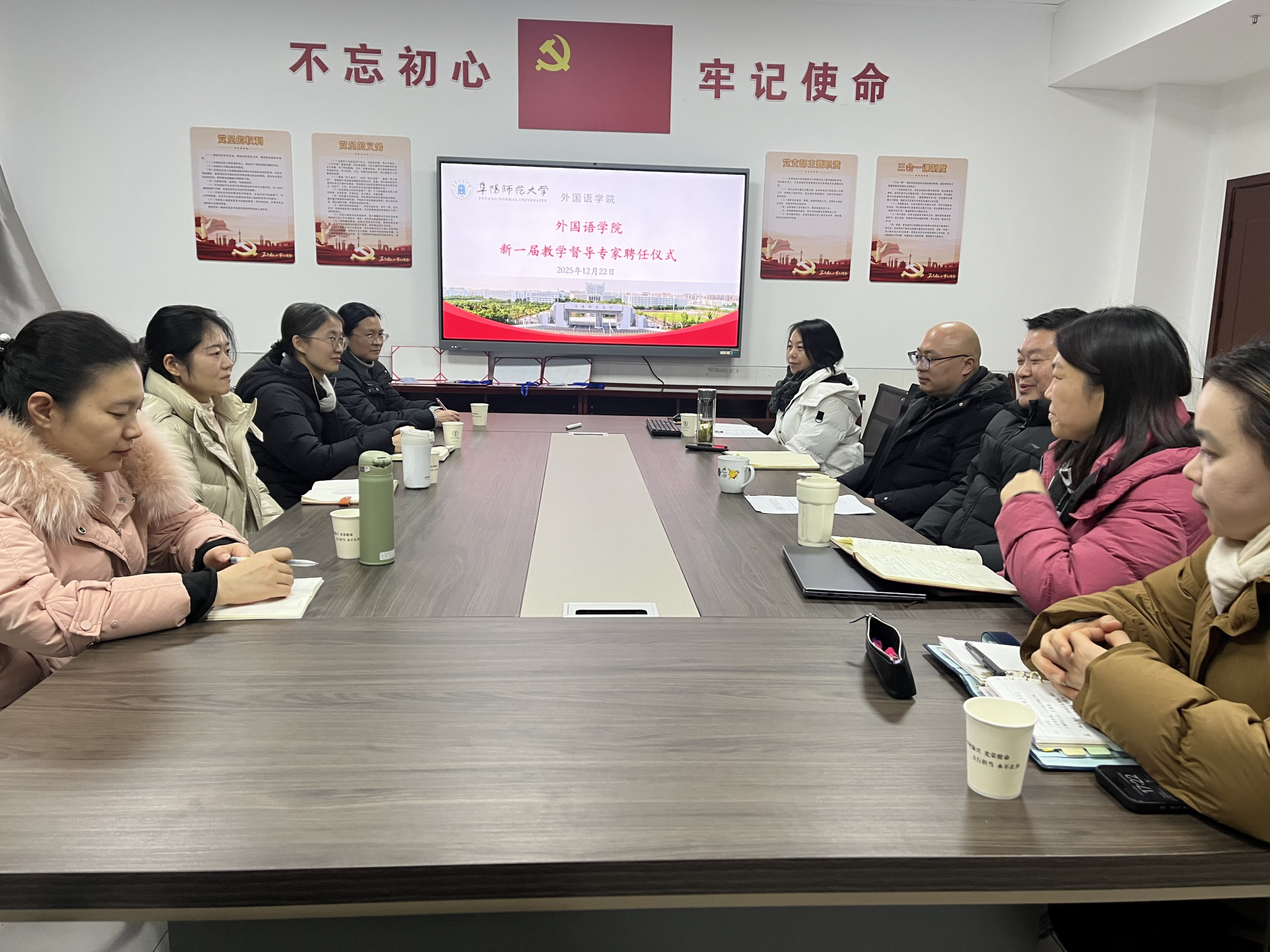 12月22日下午,外国语学院举行新一届学院教学督导专家聘任仪式暨交流座谈会。会议由学院副院长高福猛主持。新老两届教学督导组成员参加会议,院长赵从义出席并讲话。