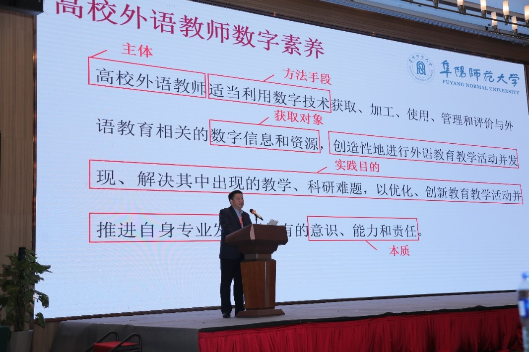 天津外国语大学原副校长、广东外语外贸大学南国商学院副院长、二级教授王铭玉,广西国际商务职业技术学院院长刘杰英,北京师范大学外文学院院长苗兴伟,马鞍山师范高等专科学校教授张勇军及巢湖学院教授慕媛媛,立足各自研究方向分别作了《从教育现代化来看教育:问题·分析·建议》《职业教育走出去的思考和实践探索》《文化传播能力培养视角下讲好中国故事的话语实践》《综合化背景下英语教育历史、现状与思考》《数智化时代的语言研究与应用:知识共享与行为建模》的大会主旨报告。