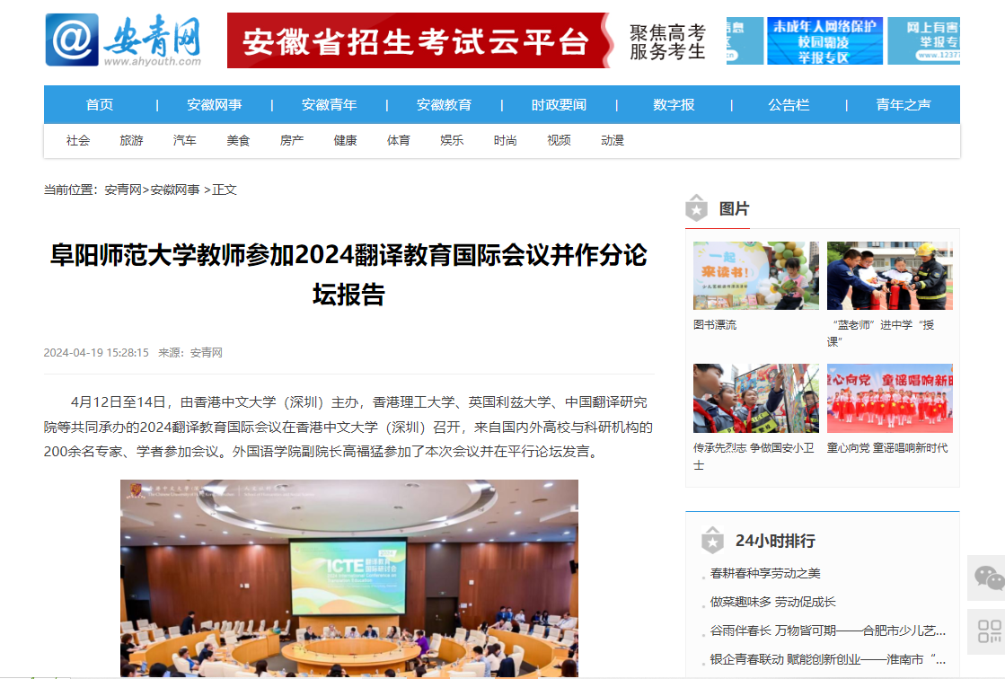 安青网报道:阜阳师范大学教师参加2024翻译教育国际会议并作分论坛报告