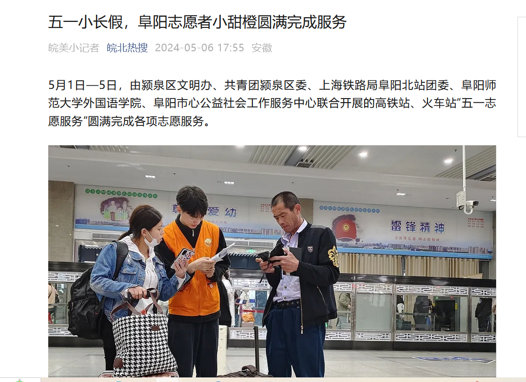 皖北热搜报道:五一小长假,阜阳志愿者小甜橙圆满完成服务