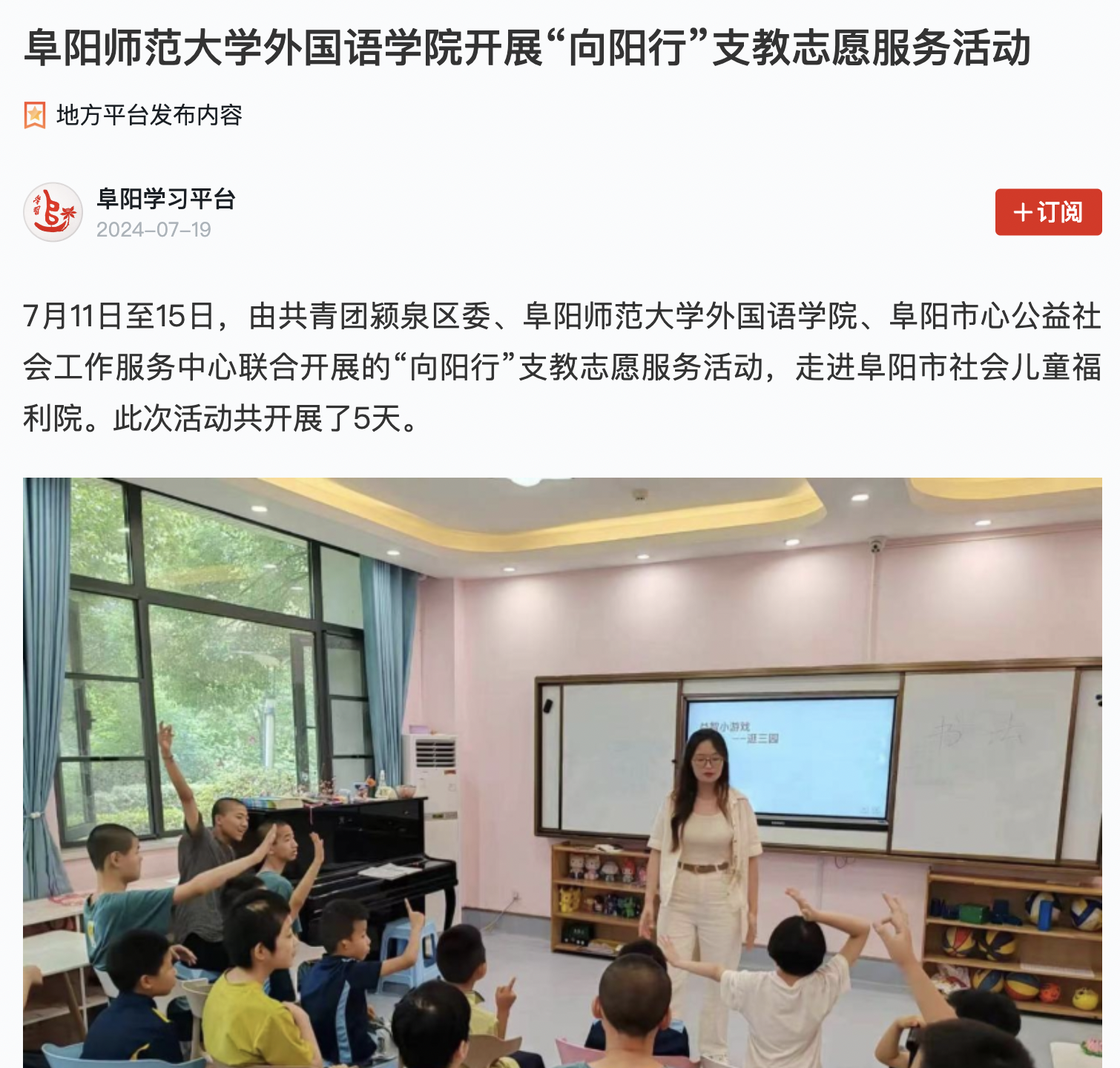 7月19日,“学习强国”阜阳学习平台报道:阜阳师范大学外国语学院开展“向阳行”支教志愿服务活动,文章地址:https://article.xuexi.cn/articles/index.html?art_id=16048296168263381865&cdn=https%3A%2F%2Fregion-anhui-resource&item_id=16048296168263381865&study_style_id=feeds_opaque&t=1721359567448&showmenu=false&ref_read_id=2aa64080-b83a-425c-83f5-bf6b38b3ed64_1721370756802&pid=&ptype=-1&source=share&share_to=wx_single