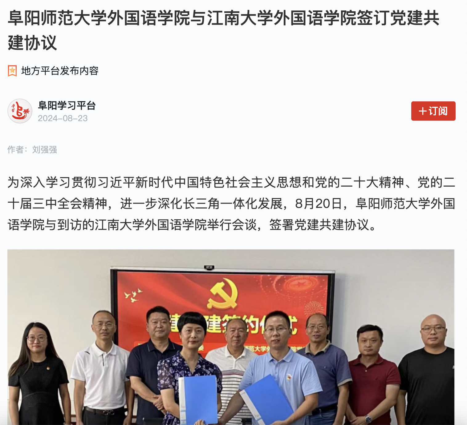 8月23日,“学习强国”阜阳学习平台报道:阜阳师范大学外国语学院与江南大学外国语学院签订党建共建协议,文章地址:https://article.xuexi.cn/articles/index.html?art_id=7210141808067067384&cdn=https%3A%2F%2Fregion-anhui-resource&item_id=7210141808067067384&study_style_id=feeds_opaque&t=1724404120154&showmenu=false&ref_read_id=69acda19-a549-486e-8476-92111043bb6b_1724485083007&pid=&ptype=-1&source=share&share_to=wx_single