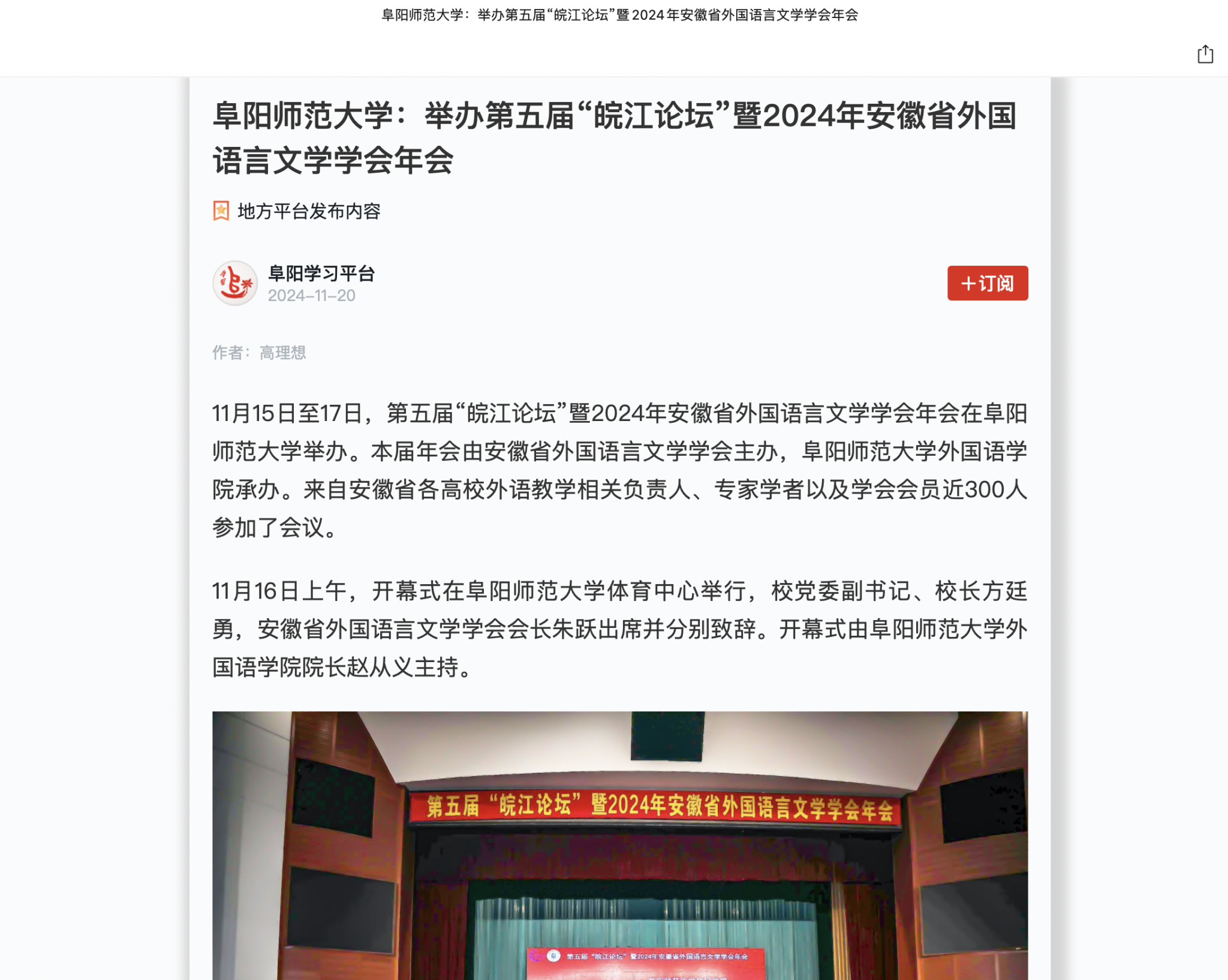 “学习强国”阜阳学习平台报道:阜阳师范大学:举办第五届“皖江论坛”暨2024年安徽省外国语言文学学会年会