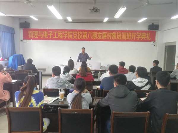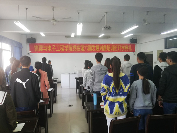 开学典礼在在雄壮的国歌声中拉开序幕。马健首先从我院党员发展的基本情况、对党员发展对象进行培训的目的和意义等方面作了阐述,并从端正学习态度树立良好学风、突出重点认真学习党章、全面落实各项培训任务、严格要求自己充分发挥先锋模范作用等方面对参训学员提出了具体要求。田志坚在总结时要求参训学员要端正学习态度,严格准守学习纪律;要认真学习、潜心思考,圆满完成本次党课学习任务。