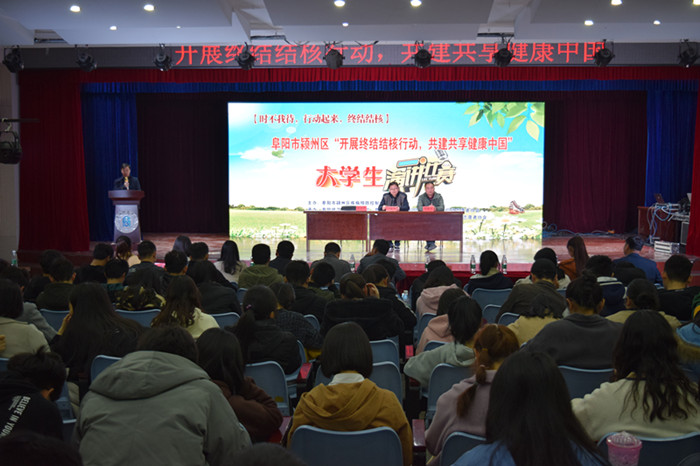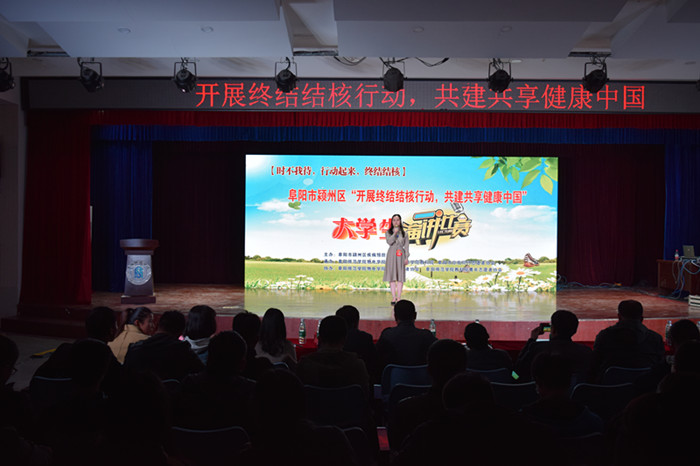 在第23个世界防治结核病日到来之际,为进一步提高同学们对结核病的认知与预防意识,我院在进行主题班会教育、肺结核宣传志愿者骨干培训的基础上,又联合教育学院在西湖校区小礼堂举办以“时不我待,行动起来,终结结核”为主题的春季传染病防控演讲比赛。出席演讲比赛的嘉宾有阜阳市疾病预防控制中心结核病防治科科长丁振涛,颍州区疾病预防控制中心副主任周建华,阜阳市“你我同行”志愿者协会胡刚老师和我院党委副书记田志坚。颍州区教育局刘香桂,颍州区疾控中心赵楠楠、阜阳职业技术学院护理学院老师历佩雪等6位老师担任本次比赛评委。