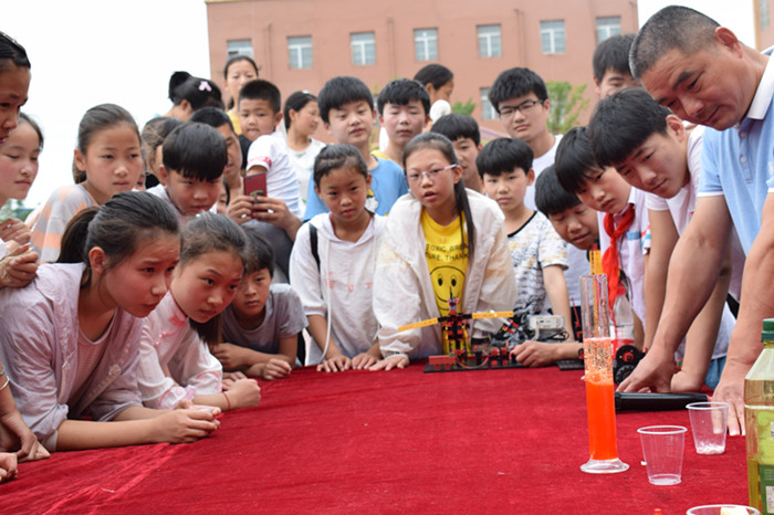王店镇中心校副校长邢大法代表该校热烈欢迎志愿者们的到来。科普宣传志愿者们结合初中物理知识,深入浅出,给该地区六、七、八年级同学演示了鸡蛋水中的沉浮、油与水的混合、“彩虹桥”等七个趣味物理小实验,并向同学们解释了实验现象的原理。在同学们热情高涨的氛围中,志愿者又向同学们展示了来自物电学院实验室的仿人避障机器人、体操机器人以及电磁节能赛车,看着机器人完成前后翻滚360°、卧撑、倒立俯卧撑等精彩的动作,同学们发出一阵阵惊呼声和热烈的掌声,与此同时,来自阿吉狗公司的负责人也为同学们展示了机器狗。同学们十分好奇并踊跃提出了自己的问题,在志愿者的细心讲解下同学们们对机器人相关基础知识有了一定的了解。活动最后,志愿者们向同学们普及了有关预防肺结核的小常识,并提醒他们在日常生活中注意个人卫生。