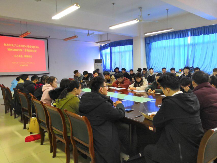 为进一步促进心联成员相互了解,助力大家在思考过去工作的基础上做出新的规划,进而促进学院心理健康教育工作再上新台阶, 2019年3月6日中午,我院心理委员联合会在躬行楼C楼306召开了以“心心共进砥砺前行”为主题的全体大会,院心理指导老师何文和全体心理委员联合会成员参加,会议由2017级通信工程1班张小川主持。