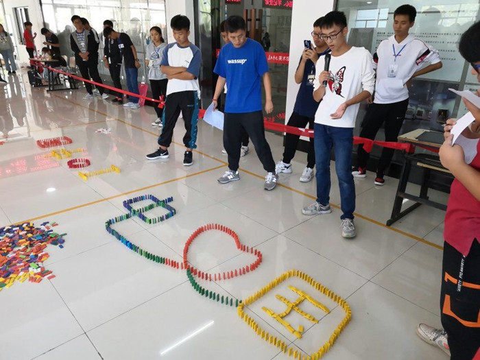 为庆祝中华人民共和国成立70周年,2019年9月28日上午,我院心理委员联合会在文科楼实训楼一楼大厅举办“方寸之间 赤心相承”多米诺骨牌大赛。我院党委书记马健和心理委员联合会指导老师何文到现场指导。本次大赛由2019级应用物理1班徐飞扬和2019级电子信息科学与技术1班张志红主持。