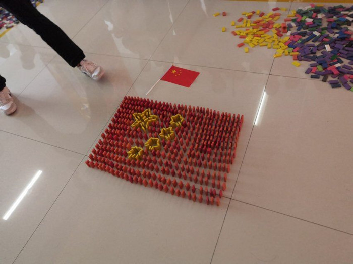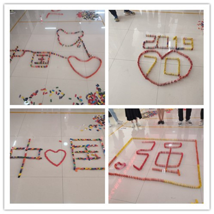 本次比赛分为两个环节。第一环节,每小组队员分工合作,将分配到的多米诺骨牌在规定时间内摆出图案;第二个环节,每小组选派代表,解释图案含义并推倒骨牌。参赛选手都十分专注地摆弄着手中的骨牌,拼出一个个对祖国充满爱意与敬意的多米诺骨牌图案。有的队伍拼出了国旗,有的队伍拼了一个大大的“强”字,简单明了的表达了对中国越来越强的美好祝福;有的队伍拼的是“1949-2019 并且中间还连着70”,这象征着中国从1949到2019已经迈过了70个年头,表达了参赛选手对祖国生日的祝福;有的队伍拼出由一个黄色的爱心包裹着一个红色的中字组成图案,这个图案表达了参赛者心中有中国,红色代表中国一派红红火火景象,黄色代表中国的腾飞,表现出参赛同学对祖国满满的爱意。在短短的十五分钟内,同学们争分夺秒、分工合作。大家都力争用新颖的创意与丰富多彩的图形来来表达自己对祖国母亲的爱意。各组的参赛选手在介绍完本队图形的意义后推倒第一个骨牌,瞬时间几百张骨牌逐浪而卧,划出一道完美的弧线,获得了大家热烈的掌声。