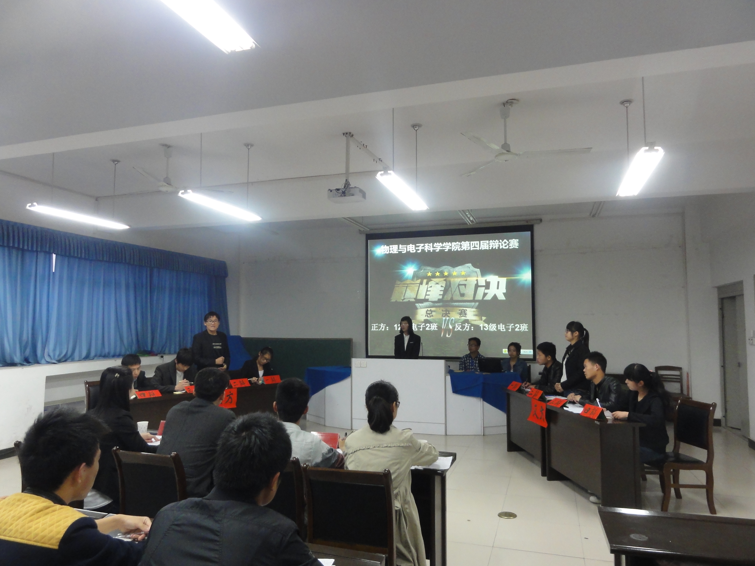 为进一步开拓大学生的创新思维、拓展视野,提升其人文素养和综合素质,3月11日,物理与电子科学学院在实验C楼505教室举办了第四届大学生辩论赛总决赛。评委由团总支书记何文及我院第三届辩论赛冠军队成员丁璇、狄辉等同学以及我院学生会副主席周晓珊同学担任。