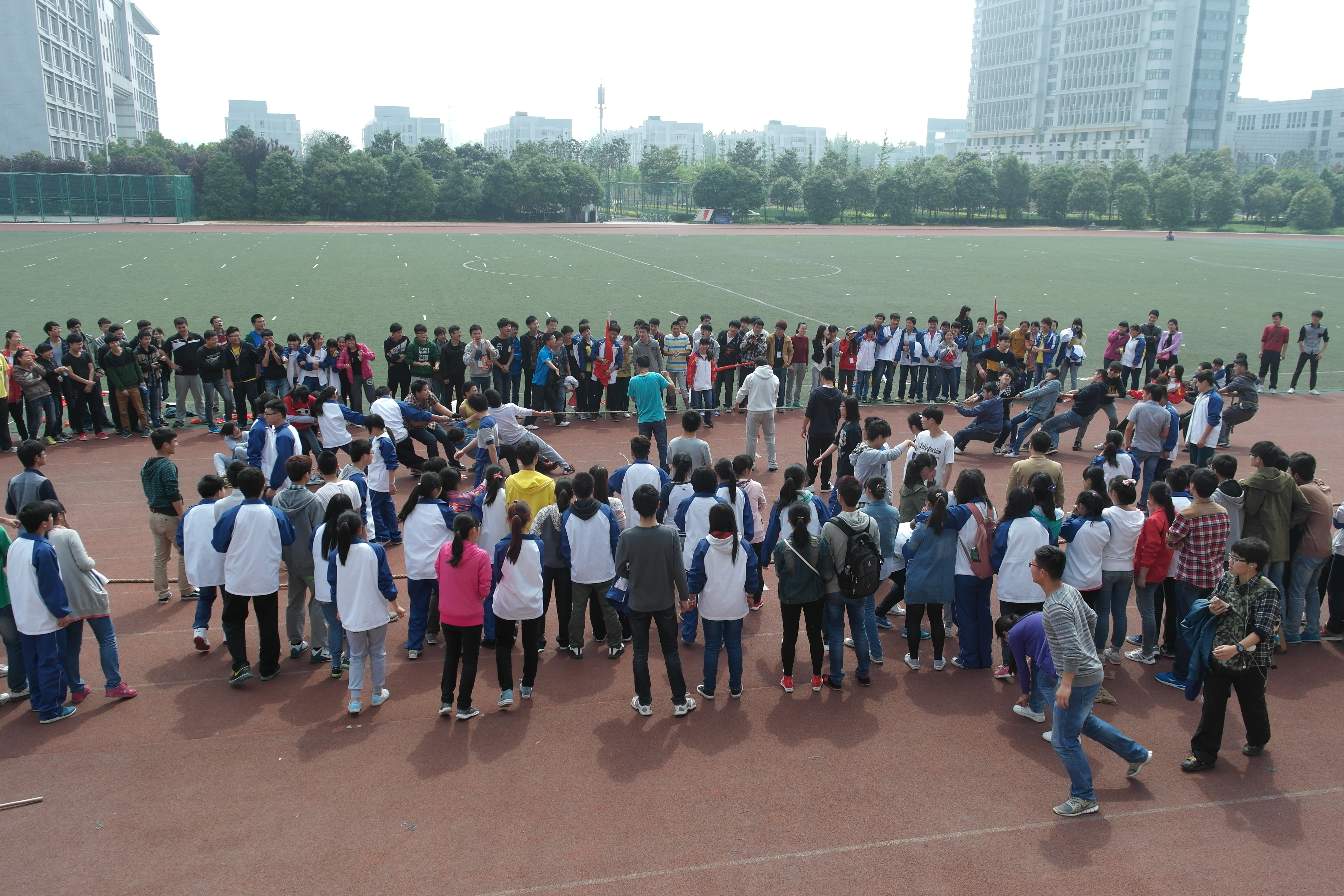 在拔河比赛中各班参赛选手卯足劲力争获得好成绩