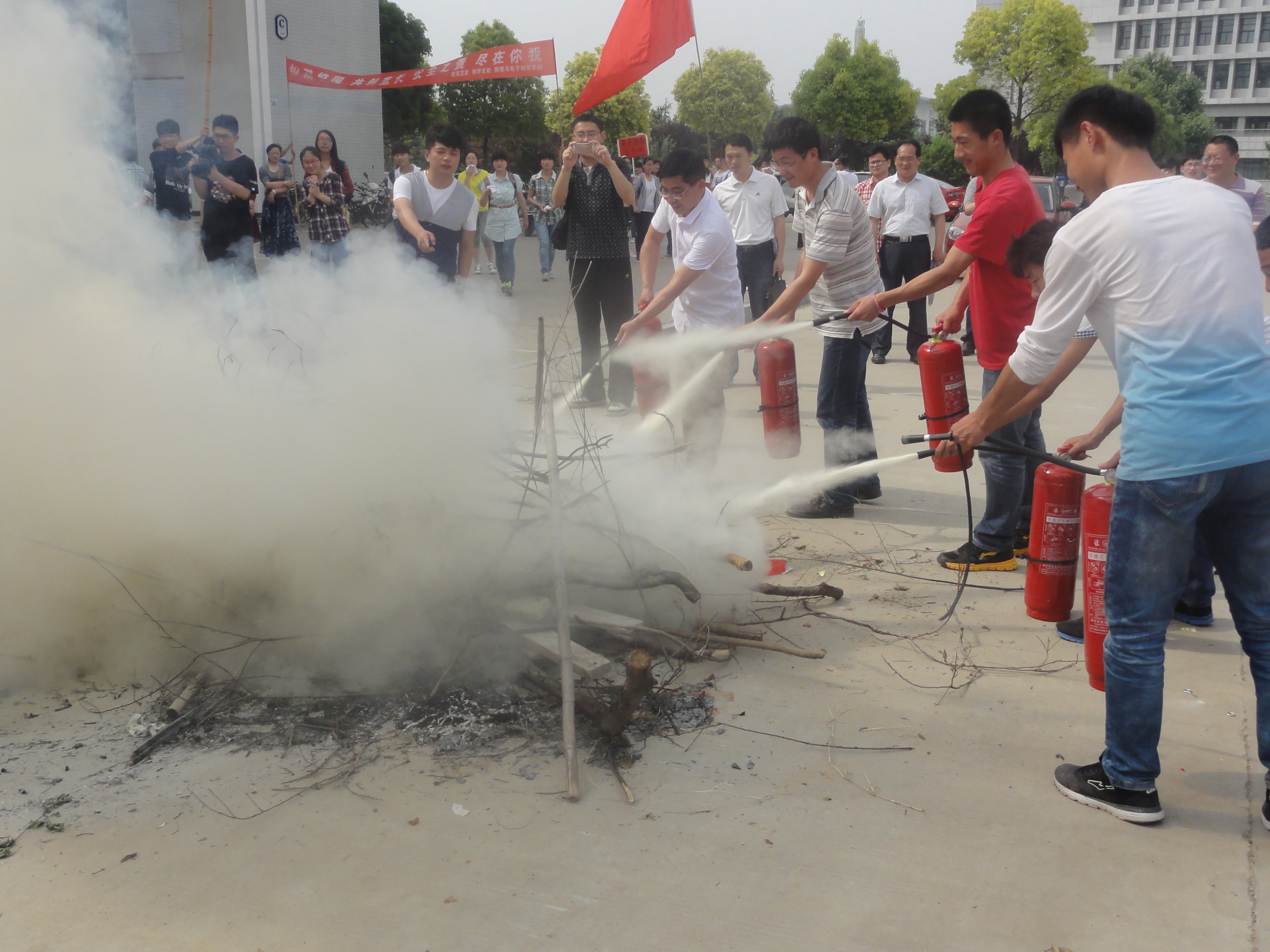 下午3:00,“地震警报”响起,孙冠奇指导学生躲入课桌下,进行了室内避震演练;随后,大学生们在实验老师和学生骨干的指导下,迅速撤离到“安全地带”,演练过程中,参与师生均能沉着冷静、服从指挥、听从命令、迅速有序地进行疏散撤离,撤离过程中无一拥挤推搡、摔倒受伤现象发生,圆满完成了此次应急疏散的演练任务。演练结束后,朱佳亮为师生演示了现场灭火技巧,部分老师和学生在他的指导下进行了灭火演练。