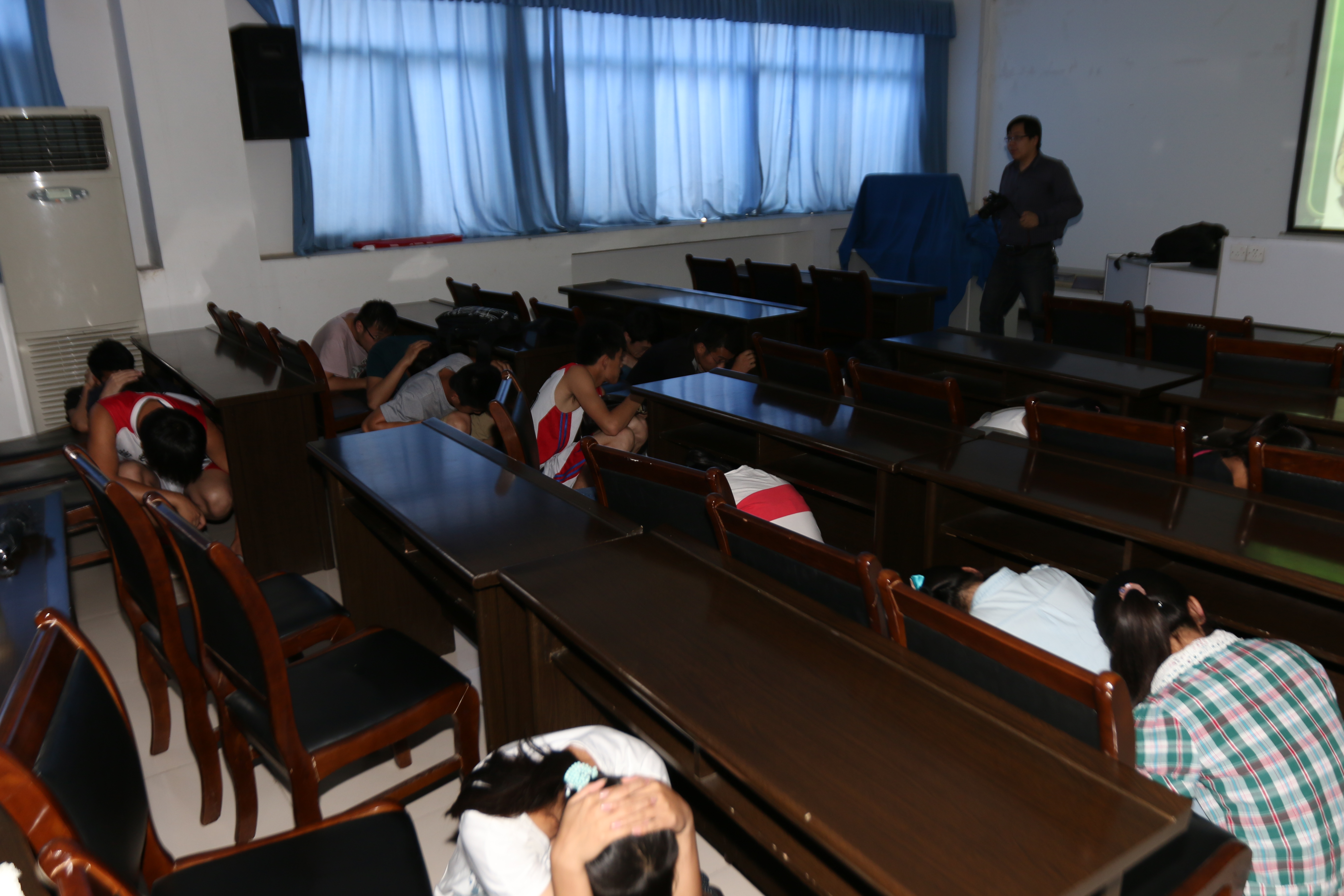 演练前,赵辉组织保卫处、学生处、各学院党总支书记在实验C楼306召开了一个安全会议,会议由梁长武主持,物理与电子科学学院党总支副书记朱义强首先汇报了安全教育月活动的总体情况以及接下来进行演练的总体步骤;梁长武强调要重视学生日常安全工作,做到信息畅通,遇突发事件时要第一时间发现上报并及时妥善处理;赵辉对本次活动的意义进行了肯定,希望各单位认真总结经验,查找不足,发现隐患,完善预案,做好准备,切实提高全县应急处置能力;进一步加强防震减灾知识和应急避难知识的宣传,共同营造全校重视应急疏散的良好氛围。