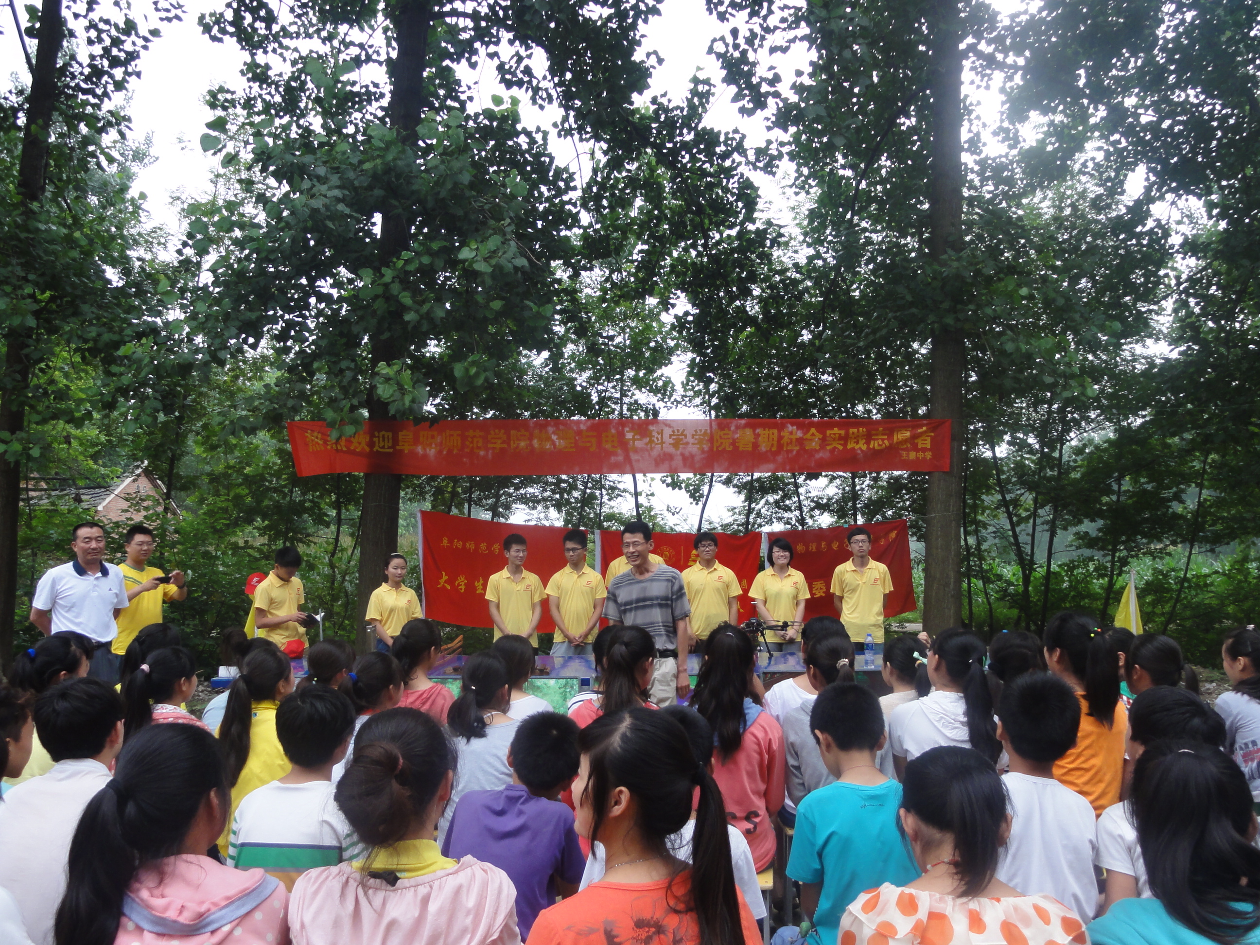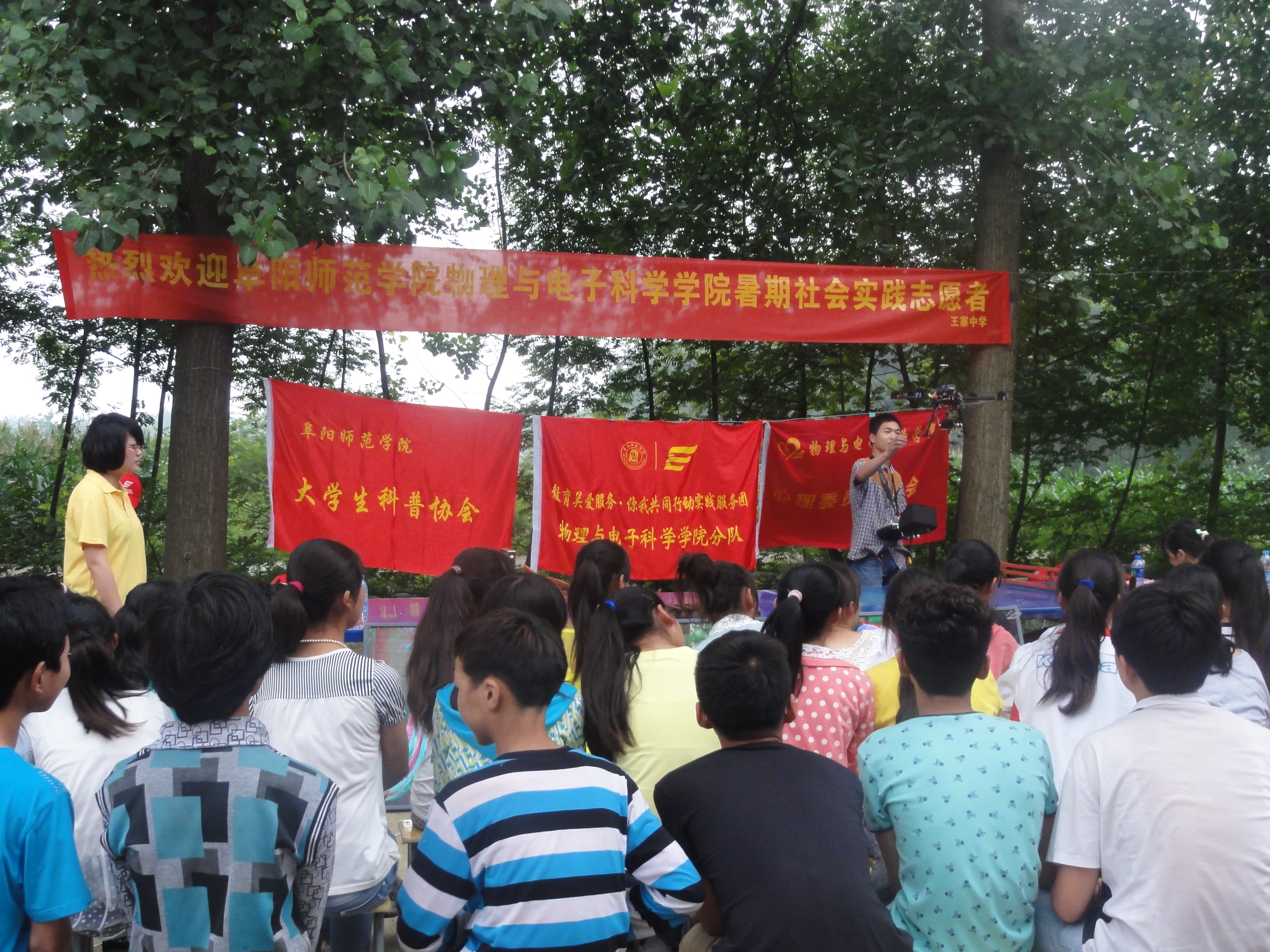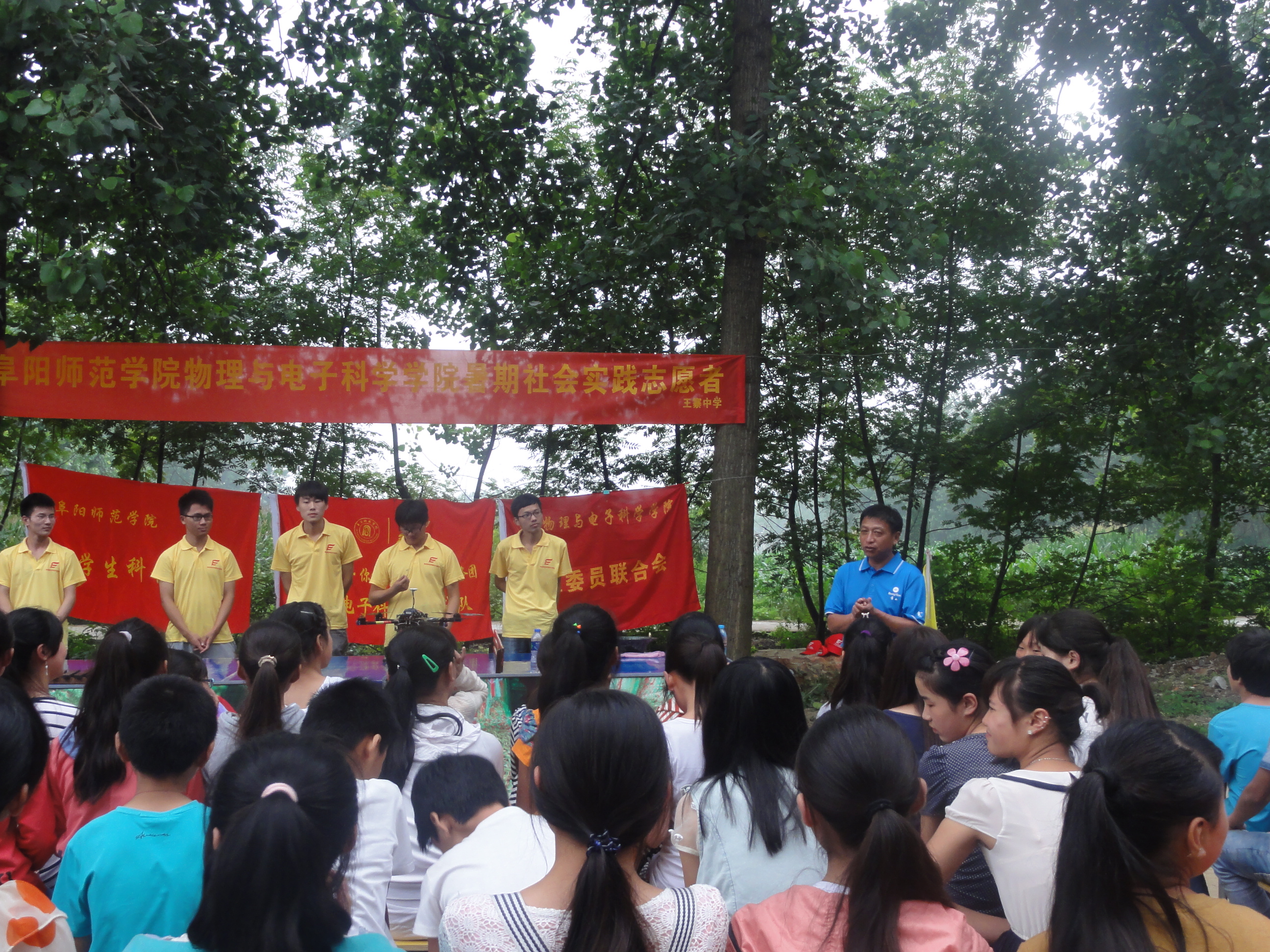 7月1日下午,志愿者们在朱义强、何文、丁智勇以及王店中学胡刚老师的带领下,奔赴阜阳市颍州区王店镇王寨中学,给农村的孩子们宣传科普知识。王寨中学校长王树标带领学校部分老师对物电学院志愿者的到来表示热烈欢迎,校长在讲话中指出科普宣传对青少年的吸引力和影响力很大,强调此类活动提高中学生的学习兴趣。