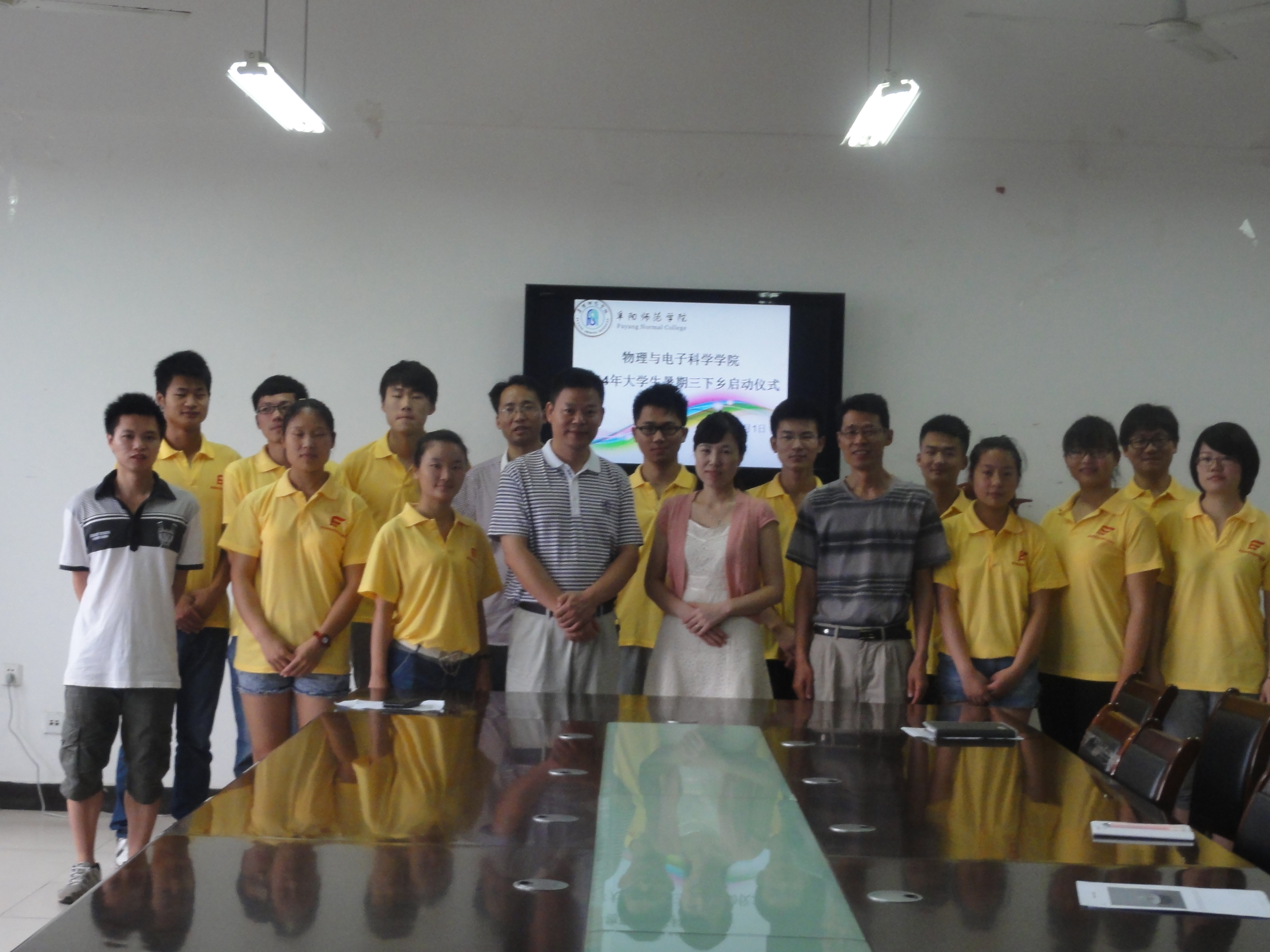 7月1日上午,物理与电子科学学院2014年大学生暑期“三下乡”社会实践活动出征仪式在西湖校区实验C楼306会议室举行,校团委副书记刘晓娟、物电学院党总支书记马健、副书记朱义强、团总支书记何文以及参加本次社会实践活动的志愿者参加,仪式由何文主持。