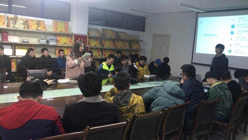 本次班会主要有以下五部分组成:1、班委学期工作总结;2、学生代表和寝室长代表发言;3、上学期班级情况总结;4、本学期班级计划;5.辅导员总结。在班委学期工作总结环节,班长王萌就寝室、五早、安全、活动、成绩等方面进行总结发言;团支书吉学云汇报了上学期活动开展和本学期计划等问题;另外,学习委员、纪律委员等班委发言,总结了目前班级班风、学风方面存在的问题。班会最后由辅导员孙倩倩老师进行总结,她告诫我们学习是学生的天职,是大学生的本分。要像优秀看齐,珍惜并利用好宝贵的大学时光。