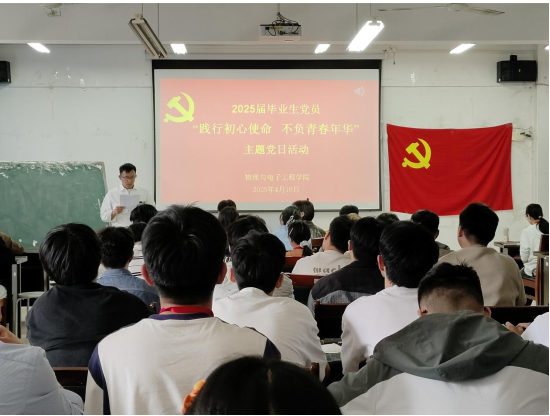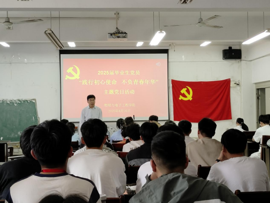 为强化毕业生党员的教育,引导他们铭记党员身份,在新的人生征程中继续发挥先锋模范作用,4月16日上午,物理与电子工程学院学生党支部联合开展2025届毕业生党员“践行初心使命 不负青春年华”主题党日活动。学院党委书记吴学军、各学生党支部书记和全体毕业生党员参与,活动由物理系学生党支部书记李军主持。