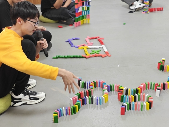 活动过程中,参与同学在阐述所搭建图案的意义并推倒搭建的骨牌后,和其他同学交换位置,给原先搭建的同学拼出代表鼓励的图案,用言语解释其含义并给予支持或建议,这种独特的互动方式,让大家在交流中彼此理解、共同成长。在搭建代表烦恼的骨牌图案时,同学们将抽象的情绪转化为可见的实体,借由搭建的专注过程实现自我疗愈,梳理内心困惑;推到骨牌,则象征着主动打破心理束缚,完成与烦恼的和解,重塑积极心态。