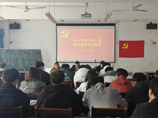 为深入学习贯彻习近平新时代中国特色社会主义思想,持续深化中央八项规定精神落实,3月31日下午,电子信息系学生党支部于躬行C楼505教室召开深入贯彻中央八项规定精神学习教育主题学习会。本次专题教育学习由支部书记陶清主持,组织委员兼纪检委员吴慧梓同志领学,支部全体党员参与。
