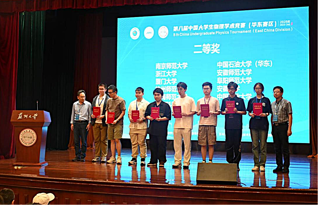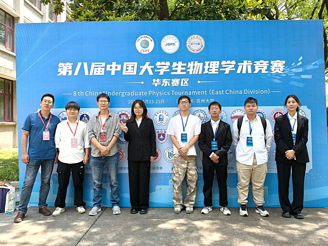 5月23日至26日,中国大学生物理学术竞赛(华东赛区)于苏州大学盛大举办,此次赛事汇聚了来自安徽、上海和江苏等省市高校的 42 支精英队伍,各参赛队伍在赛场上展开了激烈的角逐。学院从参加省赛的四支队伍的20名队员中优中选优,重新组建了一支精英队伍参赛。面对强手如林的竞争局面,队员们顶住压力,以昂扬的斗志投入比赛。他们在赛场上沉着冷静,从理论推导到实验验证,从观点陈述到质疑答辩,每一个环节都展现出扎实的专业素养和良好的竞技状态。最终,这支队伍不负众望,荣获华东赛区二等奖,在高手云集的华东地区为学校争得一席之地。