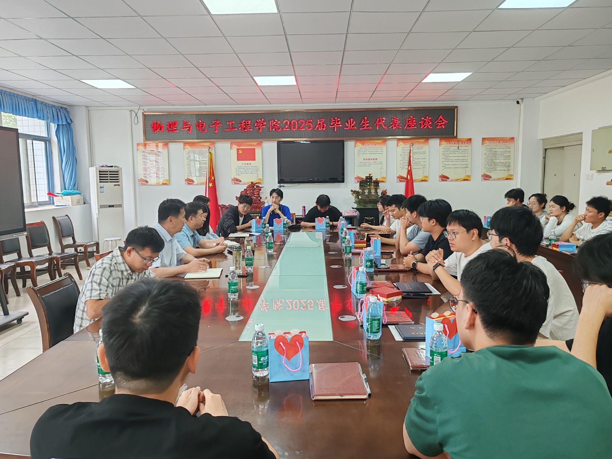 为加强与毕业生的沟通交流,充分听取毕业生对学院工作的意见建议,进一步提升学院教育教学与管理服务水平,6月11日,物理与电子工程学院在躬行C楼306会议室组织召开2025届毕业生代表座谈会,学院党委书记吴学军出席并主持座谈会,党委副书记、院长朱勇,毕业生辅导员,二十余位毕业生代表参加了会议。