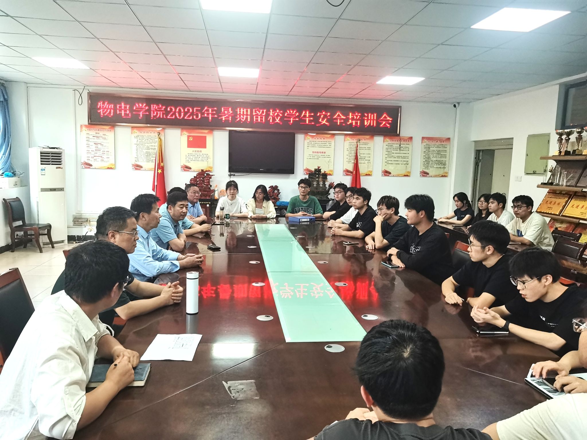 为了加强对暑期留校学生的安全教育,切实做好留校学生的管理服务工作,6月28日下午,物理与电子工程学院在躬行C楼306会议室召开2025年暑期留校学生安全教育培训会。学院党委书记吴学军出席并讲话,党委副书记、院长朱勇主持会议,有关学科竞赛指导老师、学生辅导员及部分留校学生参加了会议。