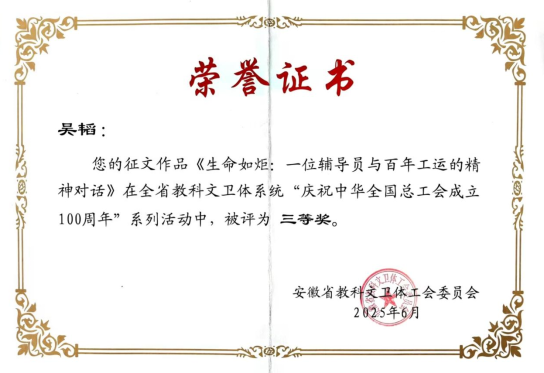 物理与电子工程学院分工会高度重视此次征文活动,积极动员分工会成员参与。吴韬老师以我院辅导员邵丽丽老师的工作经历,以及对工会工作的实践与思考,紧扣“百年工运情・匠心映江淮” 活动主题,深入挖掘百年工运历史中的精神内涵,撰写了《生命如炬:一位辅导员与百年工运的精神对话》一文。该作品最终进入省级评选环节,并在众多参赛作品中脱颖而出,获评三等奖。