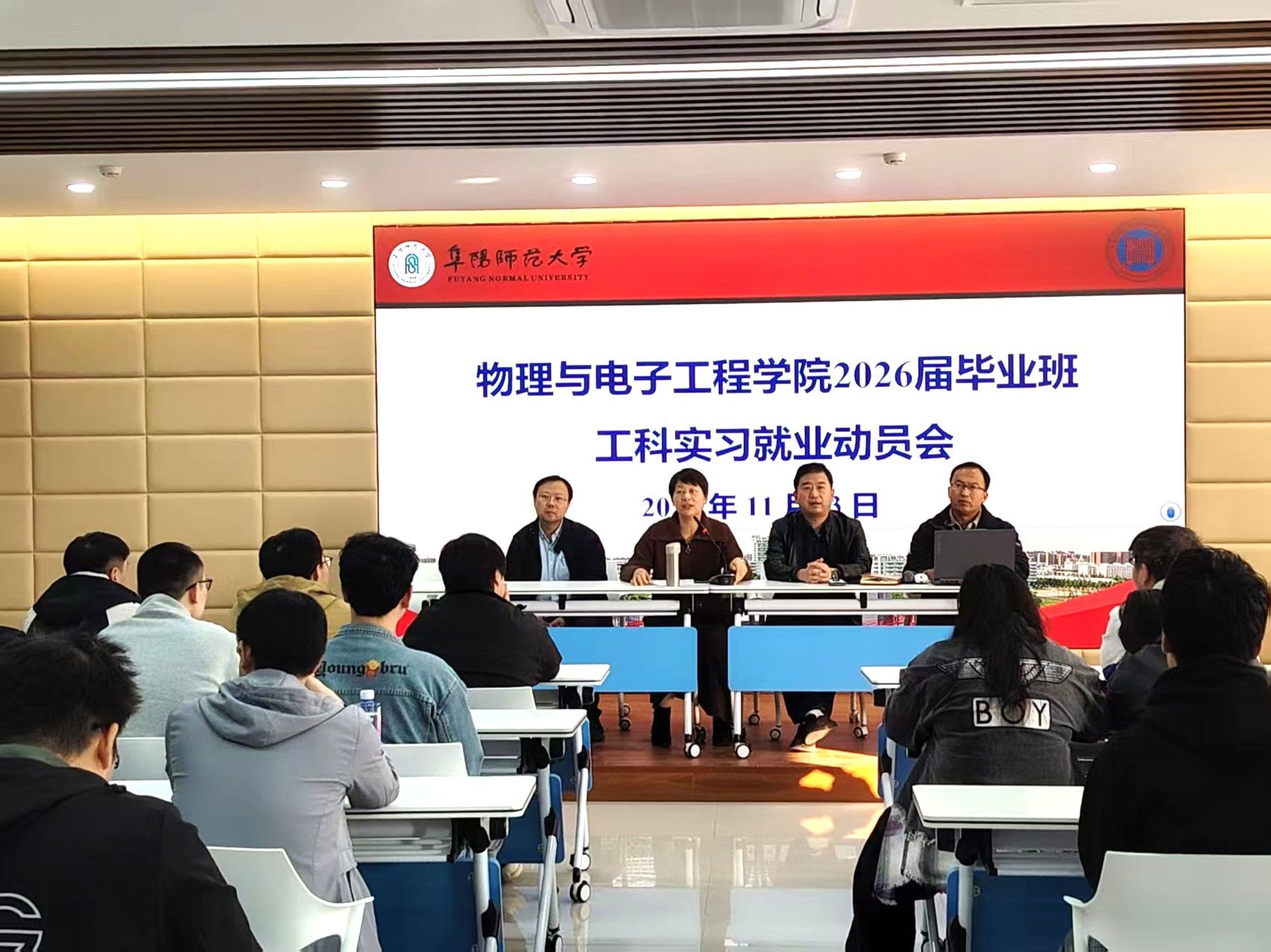 为扎实推进2026届毕业生实习与就业工作,引导学生明确目标、安全高效地完成实习任务,树立正确的就业择业观,11月13日下午,物理与电子工程学院在新工科D楼二楼报告厅召开2026届工科毕业生实习就业动员大会。学院党委书记郦丹芸、院长朱勇、实习指导教师及2022级工科专业全体学生参加会议。