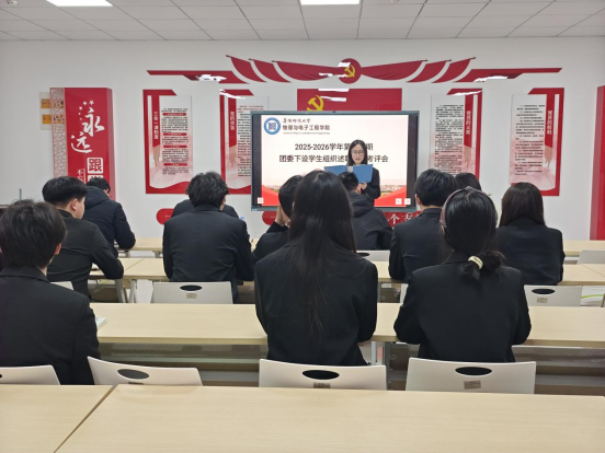 为进一步夯实学生组织建设根基,淬炼学生干部综合素养,筑牢服务同学初心使命,3月11日,物理与电子工程学院团委于新工科楼C楼504教室召开2025-2026学年第一学期学生组织述职评议考评会。学院团委负责人李振,辅导员李军、陶清、于钟慧出席会议,学生会及青年志愿者协会全体负责人参会。