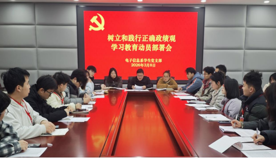 为深入贯彻落实党中央关于在全党开展树立和践行正确政绩观学习教育的部署要求,2026年3月8日下午,电子信息系学生党支部在新工科C楼508室召开专题动员部署会。会议由支部书记陶清同志主持,支部全体党员参加。