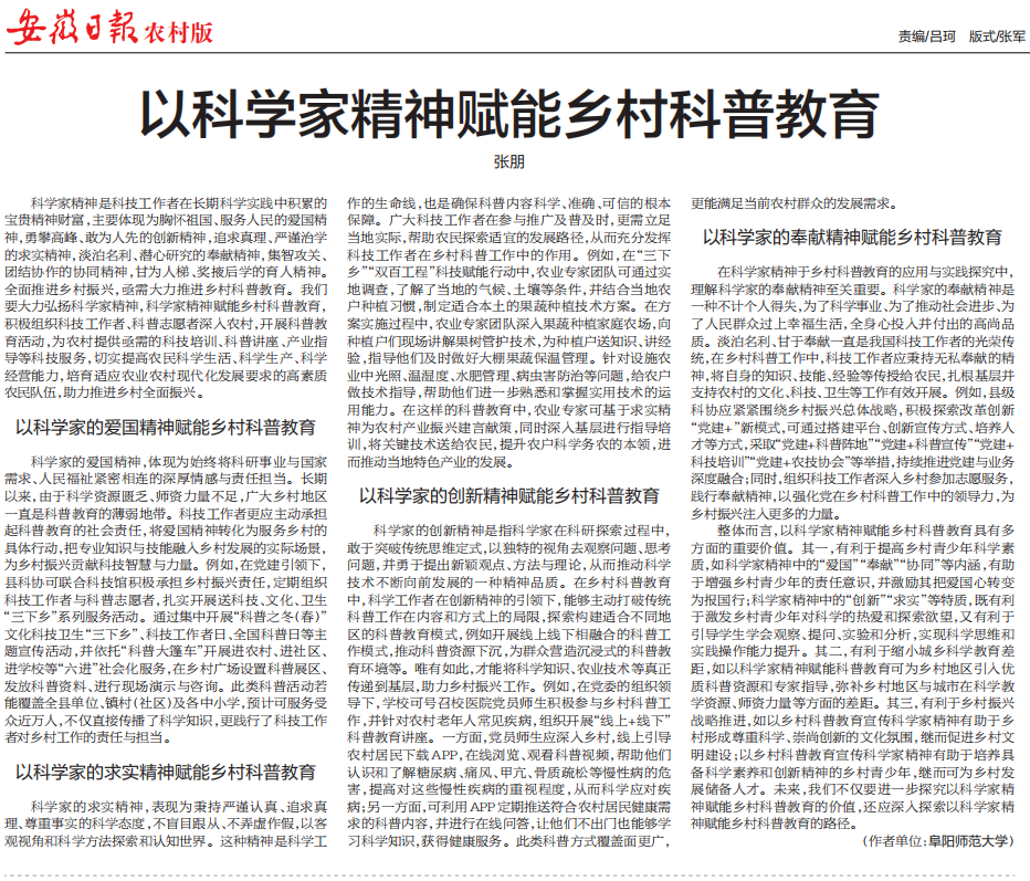 2月6日,《安徽日报·农村版》刊发我院物理系教师党支部书记张朋博士以《科学家精神赋能乡村科普教育》理论文章。该论文围绕以科学家的爱国、求实、创新、奉献精神赋能乡村科普教育为主题,提出以科学家精神赋能乡村科普教育具有多方面的重要价值。未来,不仅要进一步探究以科学家精神赋能乡村科普教育的价值,还应深入探索以科学家精神赋能乡村科普教育的路径。该理论文章也是落实推动全国“双带头人”教师党支部书记“强国行”专项行动中提供教育服务的重要成果。