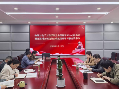 3月25日,物理与电子工程学院党委在新工科实验楼C楼召开理论学习中心组学习暨开展树立和践行正确政绩观学习教育读书班第一课。学院理论学习中心组全体成员参加会议。会议由党委书记郦丹芸主持。