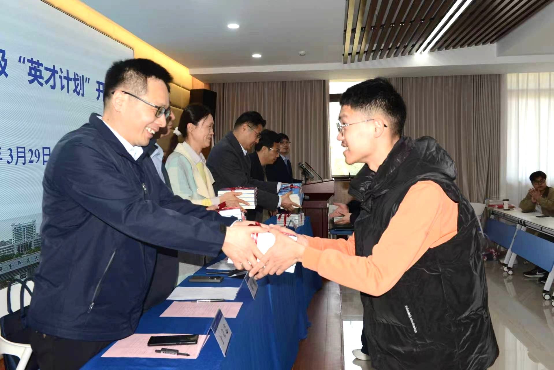 首先物电学院院长朱勇介绍了学院的优势学科和物理学学科取得的成绩和荣誉,并表示作为项目承办单位,学院将在师资队伍、教学资源、科研平台等方面为“英才计划”的实施提供有力支持。然后阜阳市教育工委委员、市教育局副局长于乾坤结合当前热点问题从爱党爱国爱家爱自己四个层面对“英才计划”学子进行了深刻的思想政治教育。最后阜阳市科协二级调研员盛琴发表了热情洋溢的讲话,并希望入选“英才计划”的学子在培训中要树立理想报国之志、磨砺求真务实之能、铸就敢为人先之魂,为将来成为国家科技创新人才打下坚实的基础。在开幕式中,出席开幕式的领导向2025年度省级“英才计划”优秀组织单位、优秀实施学校、优秀教师、优秀学员颁发了荣誉证书,向2026年度“英才计划”省市级导师颁发了聘书,并向“英才计划”学子赠送了科普图书。