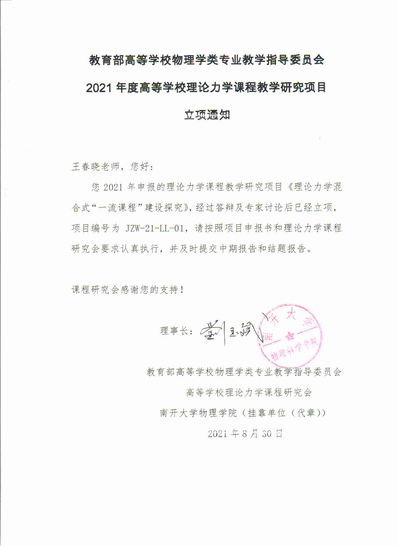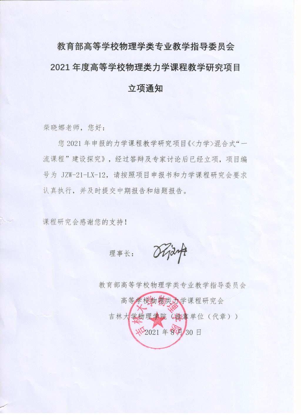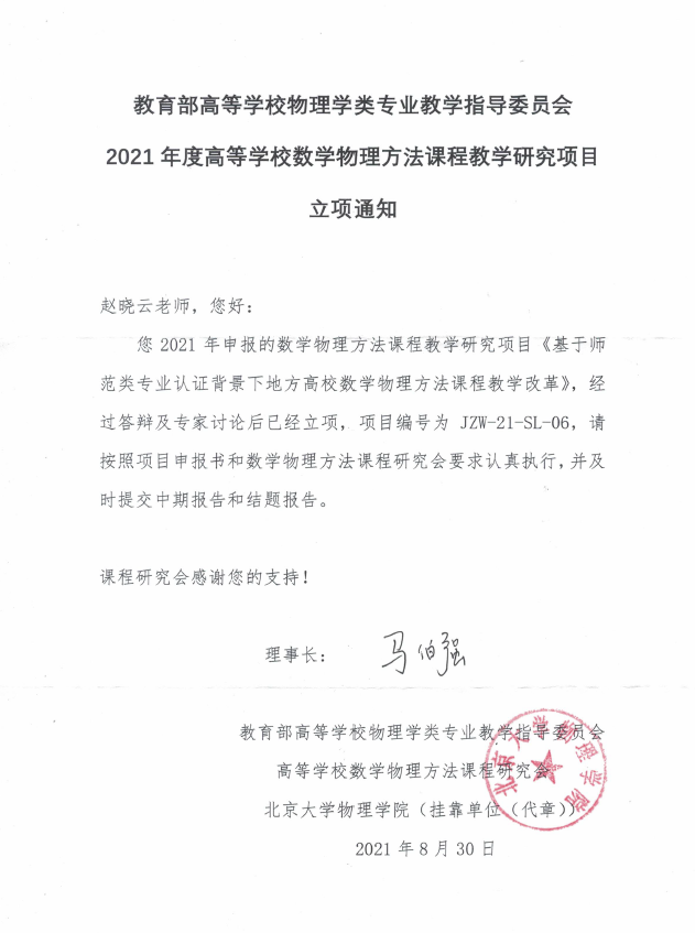 近日,教育部高等学校物理学类专业教学指导委员会公布了2021年专业教育教学改革研究课题,依托物理学国家一流本科专业建设点,我校物理与电子工程学院喜获3项课程教学研究项目立项,分别是王春晓老师的“《理论力学》混合式‘一流课程’建设探究”、柴晓娜老师的“《力学》混合式‘一流课程’建设探究”,以及赵晓云老师的“基于师范类专业认证背景下地方高校数学物理方法课程教学研究”。此次包括哈尔滨工业大学、西安交通大学、北京师范大学、厦门大学等双一流高校在内共有63个项目获批立项,我校立项数量位于前列。