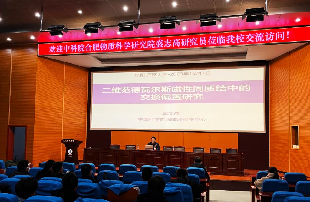 受物理与电子工程学院与信息功能材料结构与器件安徽普通高校重点实验室的邀请,2023年12月7日下午,中科院合肥物质科学研究院盛志高研究员在躬行F楼报告厅作了题名为《二维vdW磁性同质结中的交换偏置研究》的学术报告,物理类专业本科生、研究生,以及部分感兴趣的教师参加了此次报告会。