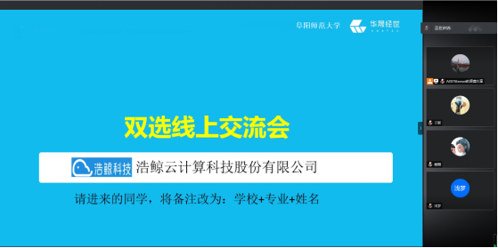 为给学生提供更多优质就业岗位,促进学生就业,2021年4月8日,阜阳师范大学ICT产教融合创新基地邀请浩鲸云计算科技股份有限公司(以下简称浩鲸科技)通过腾讯会议为合作专业学生举行线上招聘宣讲会。