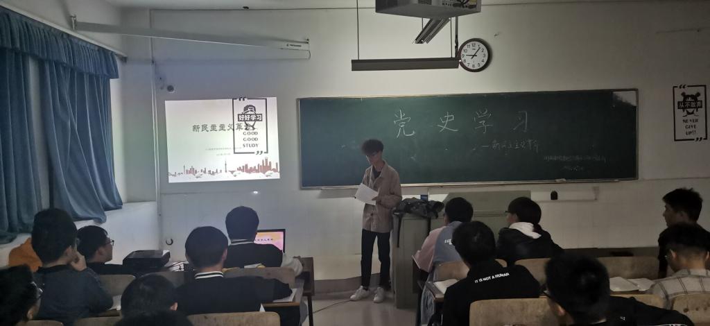 2021年4月20日晚,2019级电子信息科学与技术2班在躬行A楼204教室举办新民主主义革命党史专题学习会。出席本次学习会的有2017级通信1班班长汤宗兵、2018级电子2班纪律委员冷娇以及2019级电子信息科学与技术2班全体同学,活动由2019级电子信息科学与技术2班团支书纪康俊主持,院团委委员石英奇做主题宣讲。