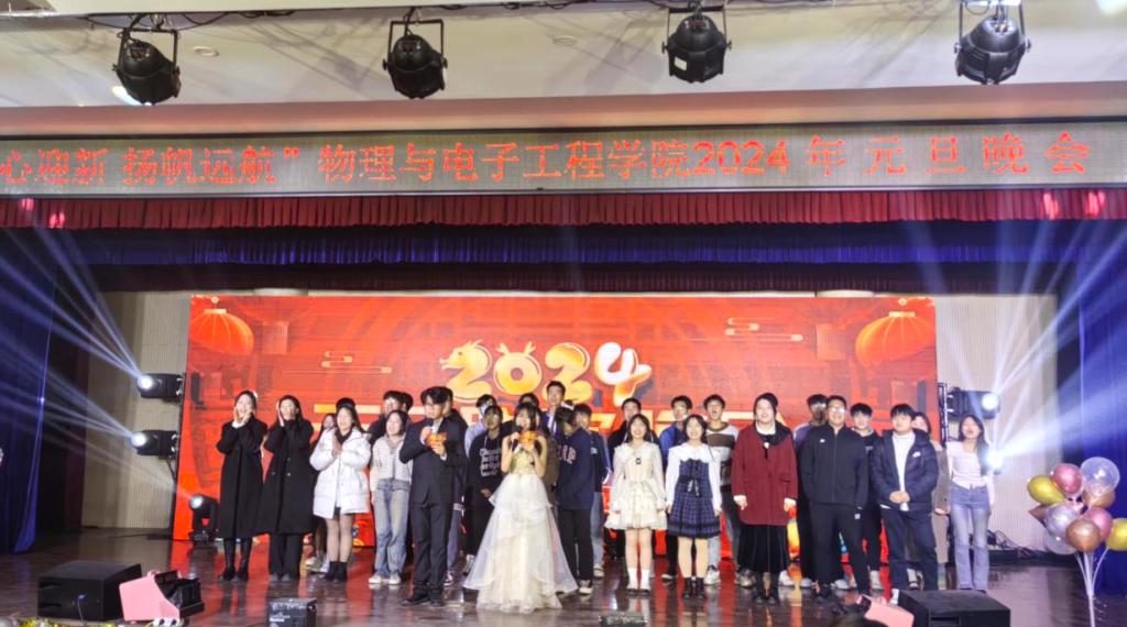 12月27日晚,物理与电子工程学院“以心迎新 扬帆远航”2024年元旦晚会在西湖校区景行楼小礼堂举行,院党委副书记张传智、教师代表朱爽鑫、辅导员代表王旭、刘少杰和各年级学生代表欢聚一堂,共迎新年。