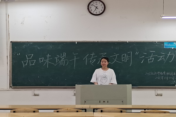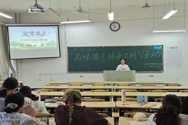 为进一步弘扬中华民族优秀传统文化,丰富节日文化内涵,在端午节到来之际,6月10日,2018级科学教育1班团支部在实验楼C楼615教室开展了“品味端午,传承文明”主题团日活动。该活动由团支书施韵主持,全体团员参与本次活动。