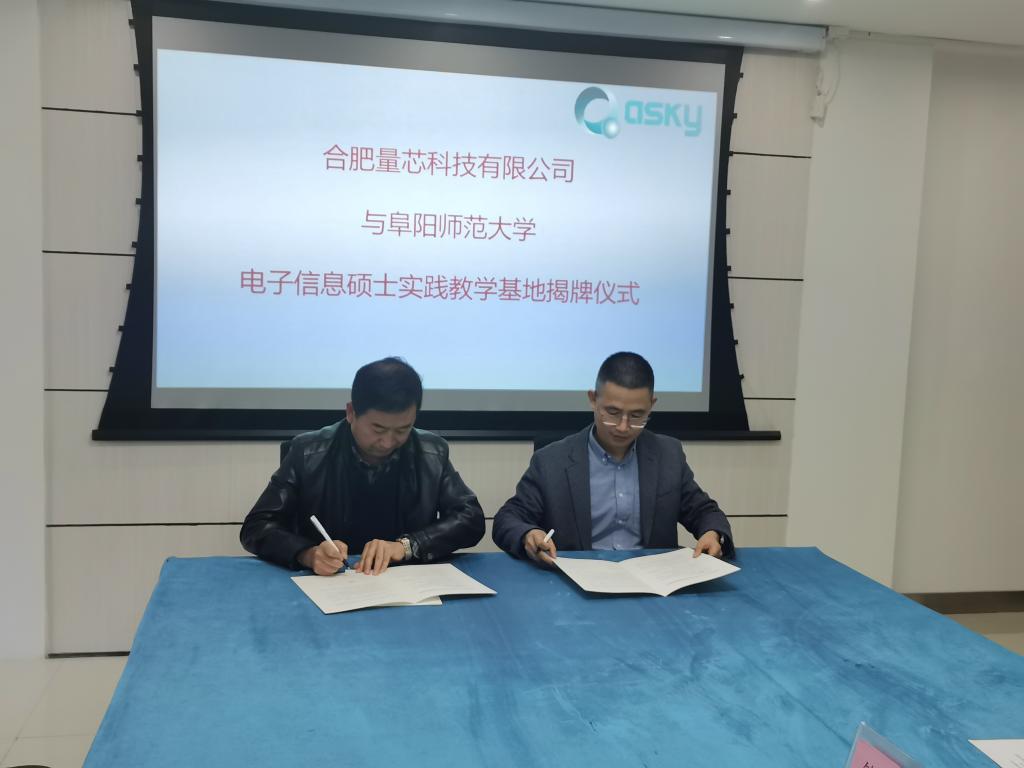 朱勇介绍了阜阳师范大学的校情、师资、历史和发展现状,重点介绍了物理与电子工程学院的专业布局、学科建设和研究生教育现状。他表示,与合肥量芯科技有限公司共建研究生实践基地,对于学院电子信息硕士点建设具有重要意义。他希望双方在研究生人才培养、师资培训、科研攻关、成果转化等方面积极合作,搭建校企合作共赢的平台。武海介绍了阜阳师范大学研究生教育的发展现状和学校关于校地共建研究生实践基地的整体构想和政策支持。他希望企业深度参与学校人才培养,共同提高研究生培养质量。